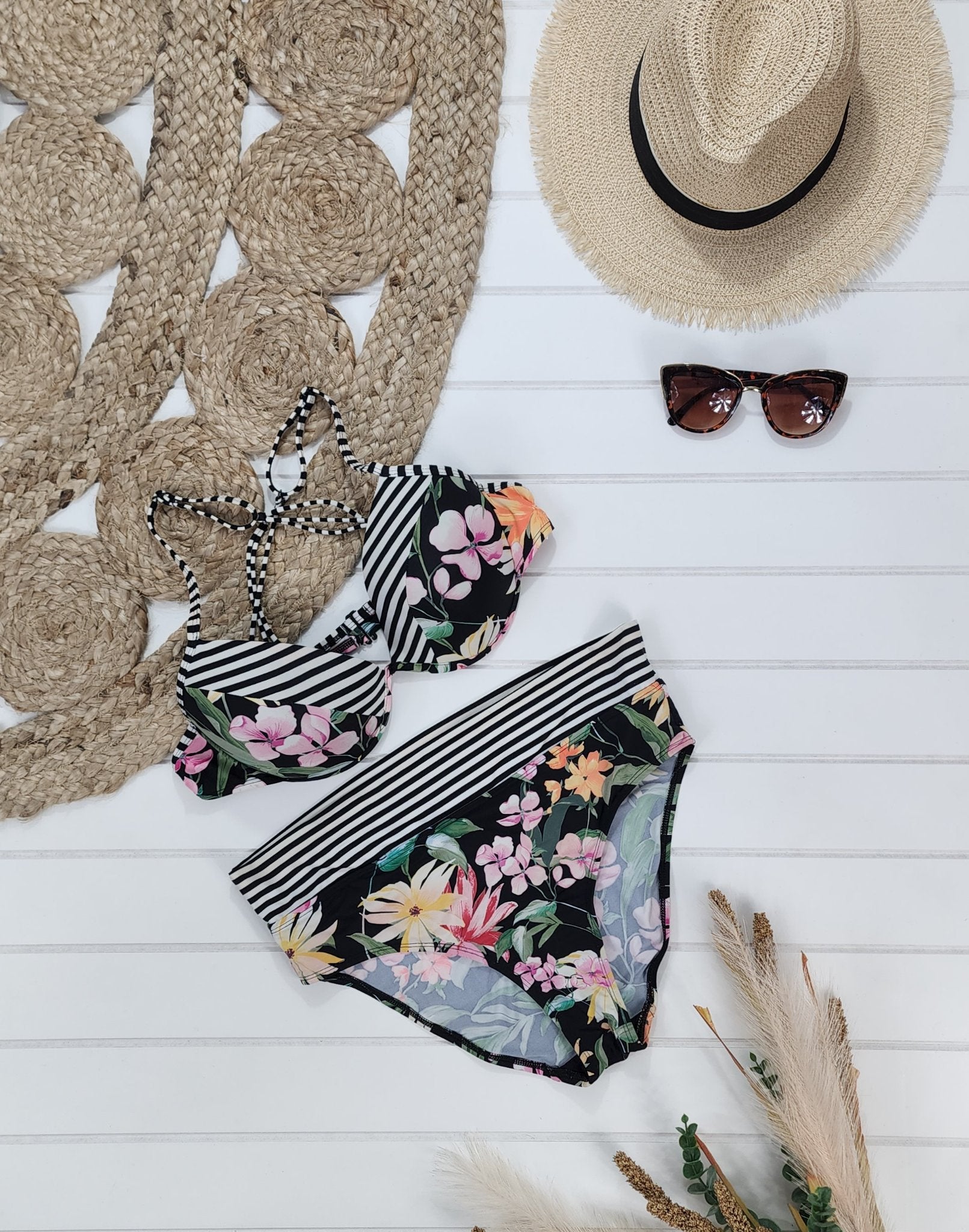 Ce bikini est un choix parfait pour les femmes qui veulent se sentir à l'aise et confiantes à la plage ou à la piscine. Avec un haut XLarge et un bas Médium, il offre un ajustement parfait pour une silhouette flatteuse. Le motif de fleurs sur fond noir ligné blanc ajoute une touche de style à ce maillot de bain élégant. Profitez du soleil en toute confiance avec ce bikini.