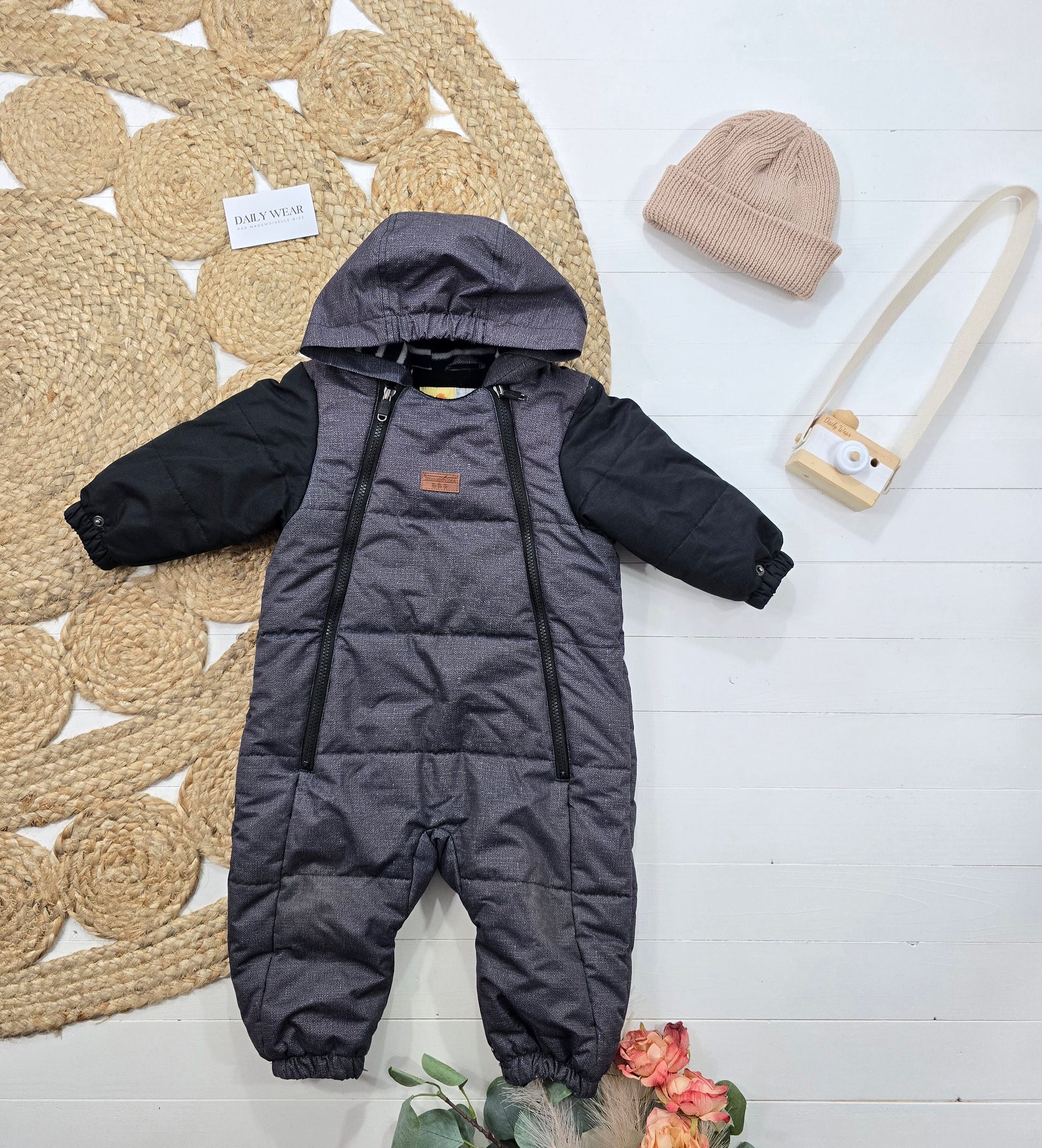 Cette Combinaison d'hiver Trois Moutons en gris foncé est parfaite pour garder bébé bien au chaud lors des journées froides. Les mitaines et les pieds manquent, mais cela permettra à bébé d'explorer avec ses mains et ses pieds en toute liberté. Disponible en taille 18 mois.