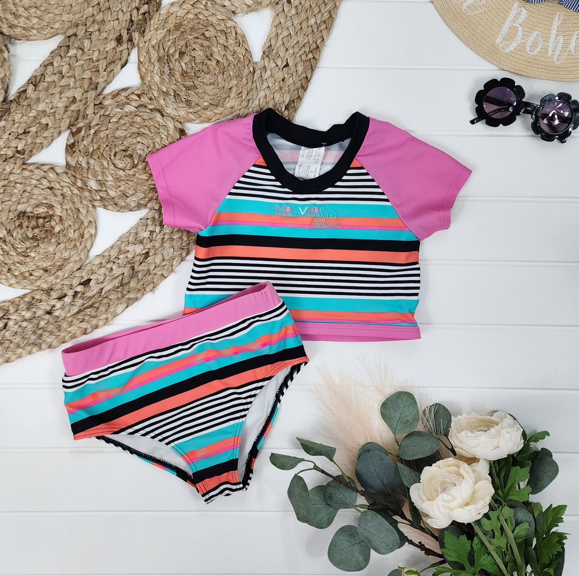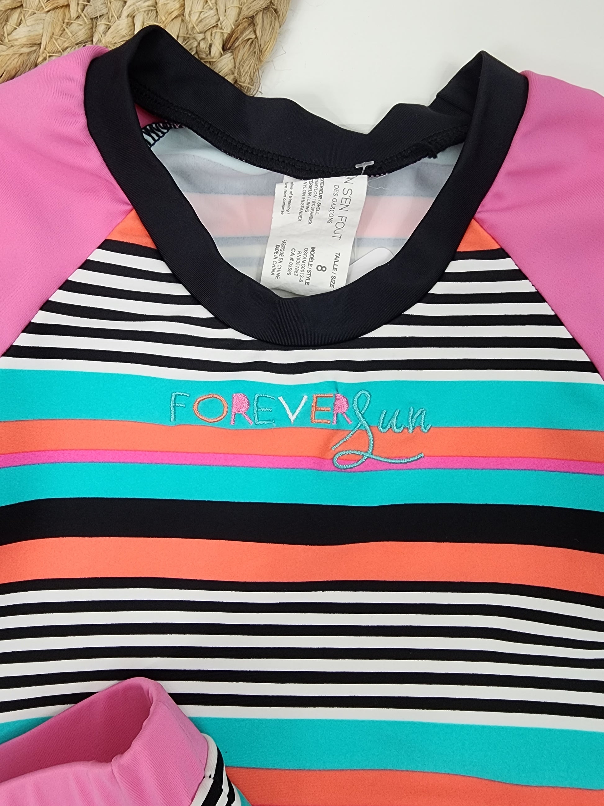 Pour les petites filles rebelles qui aiment s'amuser, ce bikini aux couleurs vibrantes et lignes originales est idéal! Le noir, blanc, bleu et orange s'harmonisent à merveille. On s'en fout des garçons, l'important c'est le style! (Seulement 8 ans.)