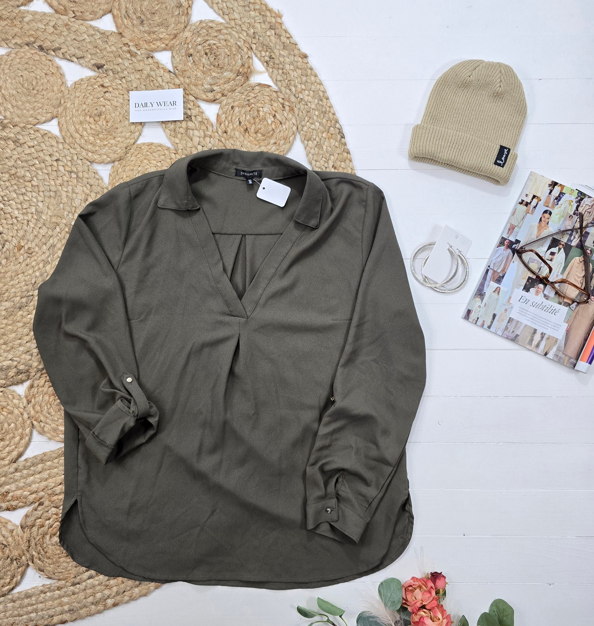 Apportez une touche de dynamisme à votre garde-robe avec la Blouse Dynamite en taille Large. Sa couleur vert kaki unique et ses manches ajustables vous offriront un style à la fois élégant et confortable. Fait de tissu non extensible, cette blouse est parfaite pour toutes les occasions. (Offre limitée : disponible en édition limitée !)