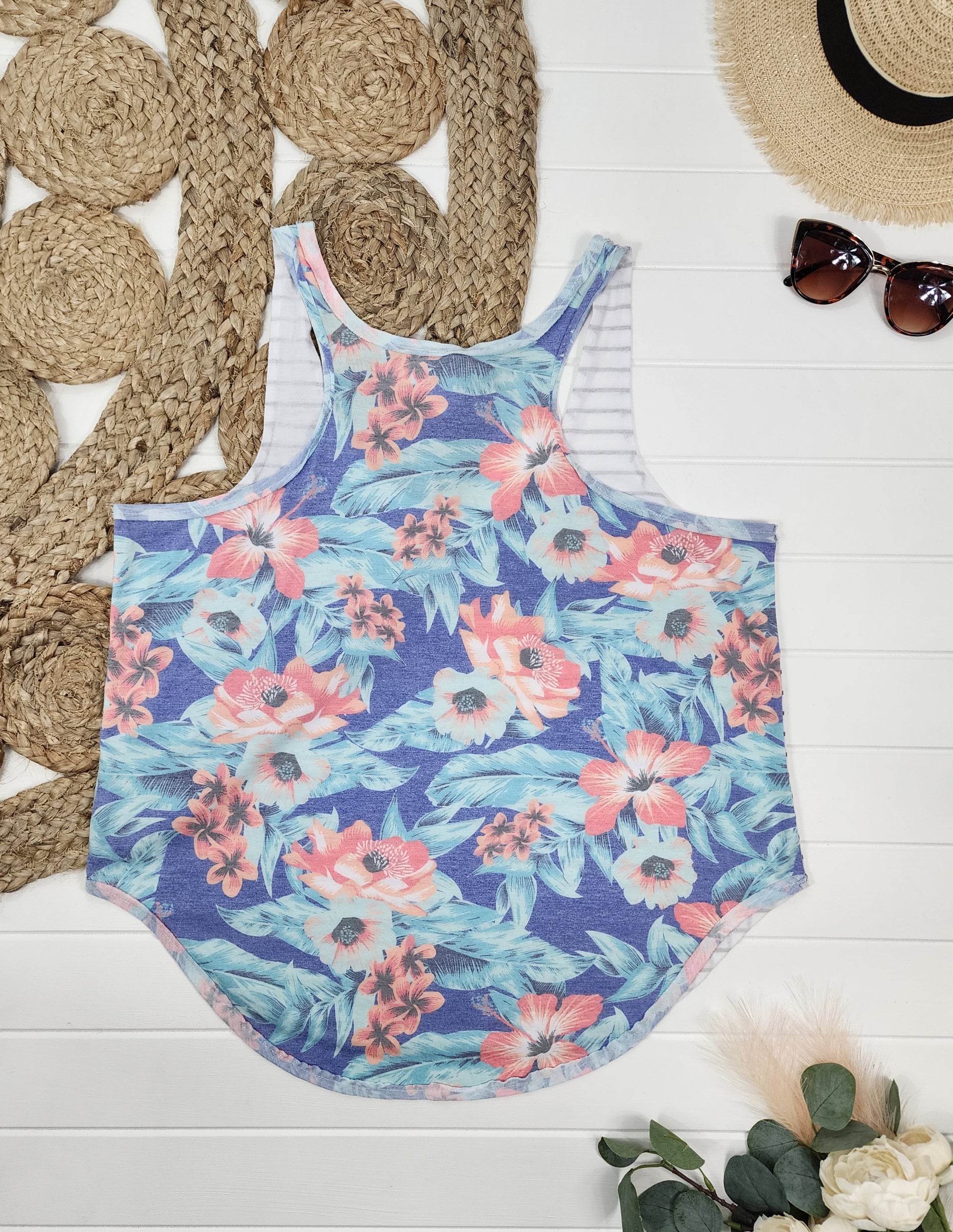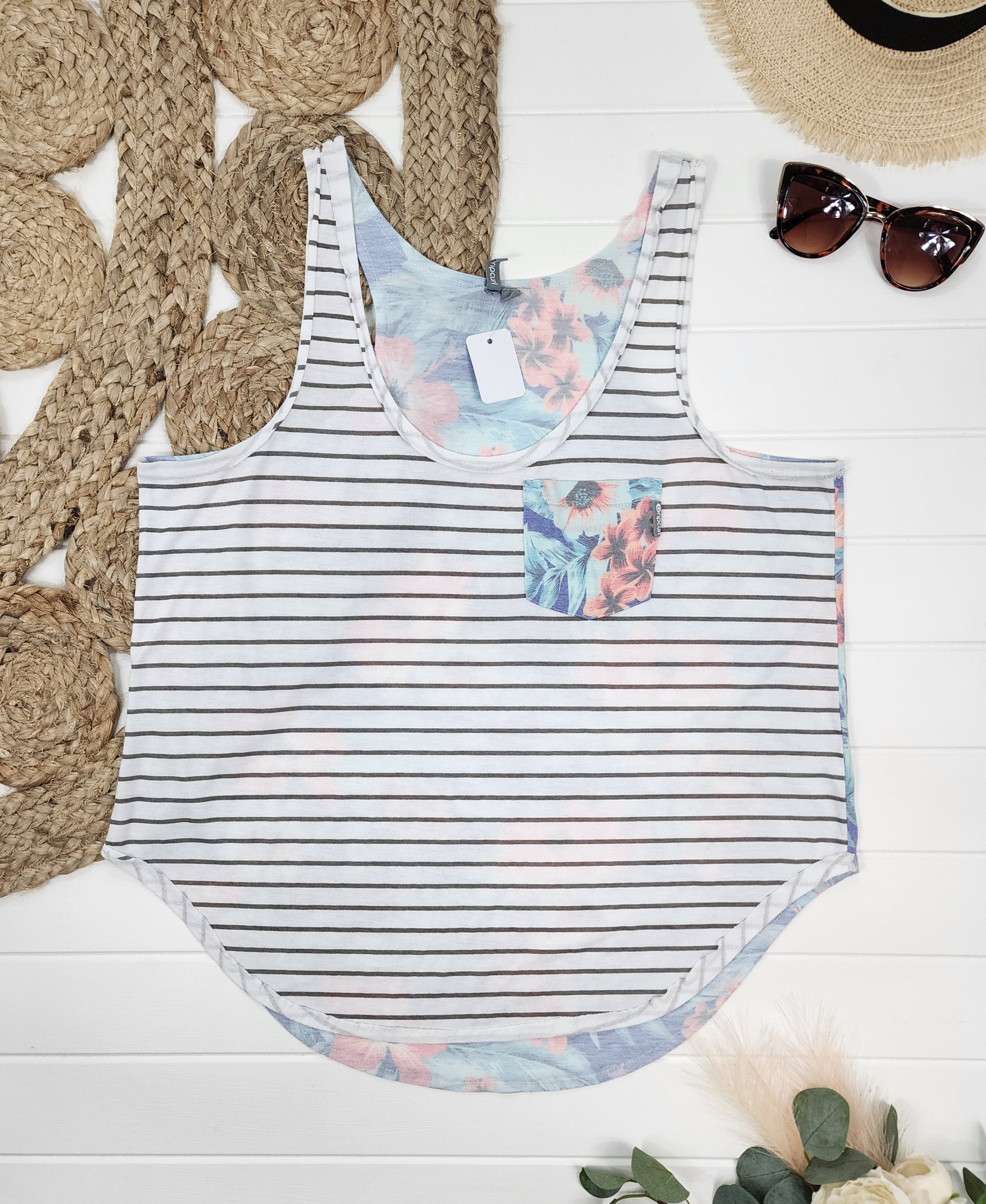 Ce camisole Ripcurl en taille Large est orné d'un motif ligné blanc et gris sur le devant et d'un motif fleuri à l'arrière. Parfait pour un look décontracté et féminin, il offre un confort optimal et une qualité supérieure. Idéal pour toutes les occasions de la vie quotidienne.
