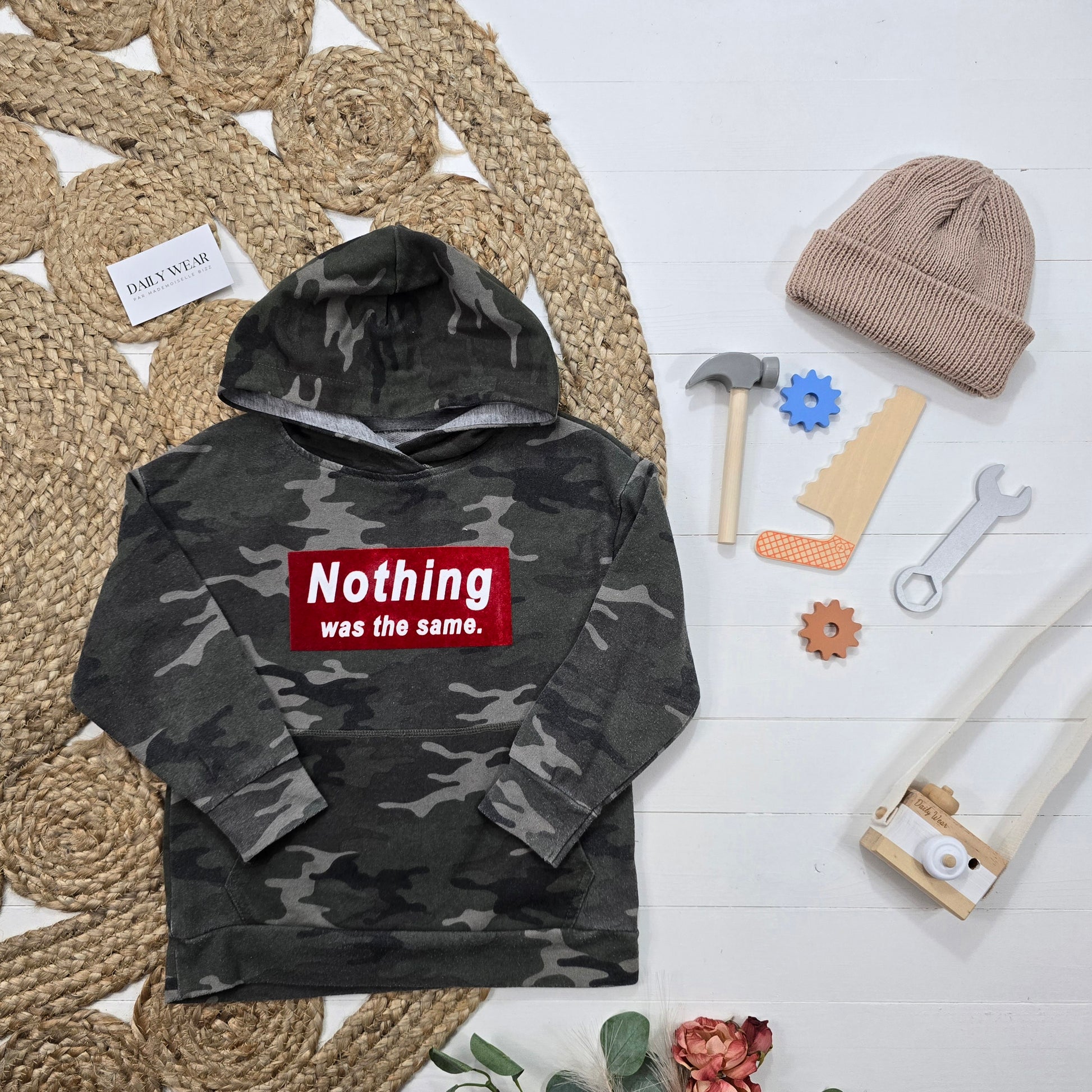 Enfilez ce chandail à capuchon H&M avec motif armé et carré rouge en velour écrit "Nothing was the same" en blanc, pour un look amusant et original! Parfait pour les enfants de 6 ans.