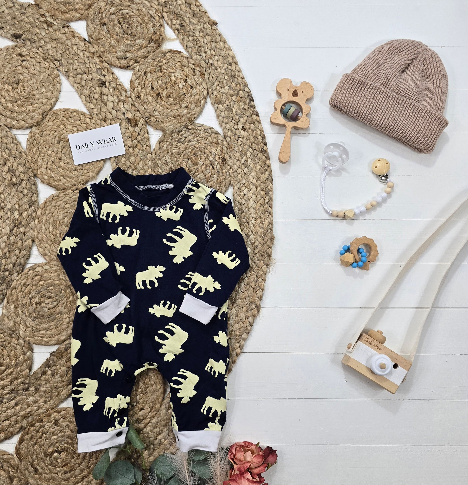 Donnez à votre bébé un look original avec notre Combinaison Noname en bleu à motifs d'orignal blanc. Avec son ouverture pratique au fesse et son message humoristique "Don't MOOSE WITH ME!", elle fera sensation. Idéale pour les bébés de 3 mois. Osez l'originalité!