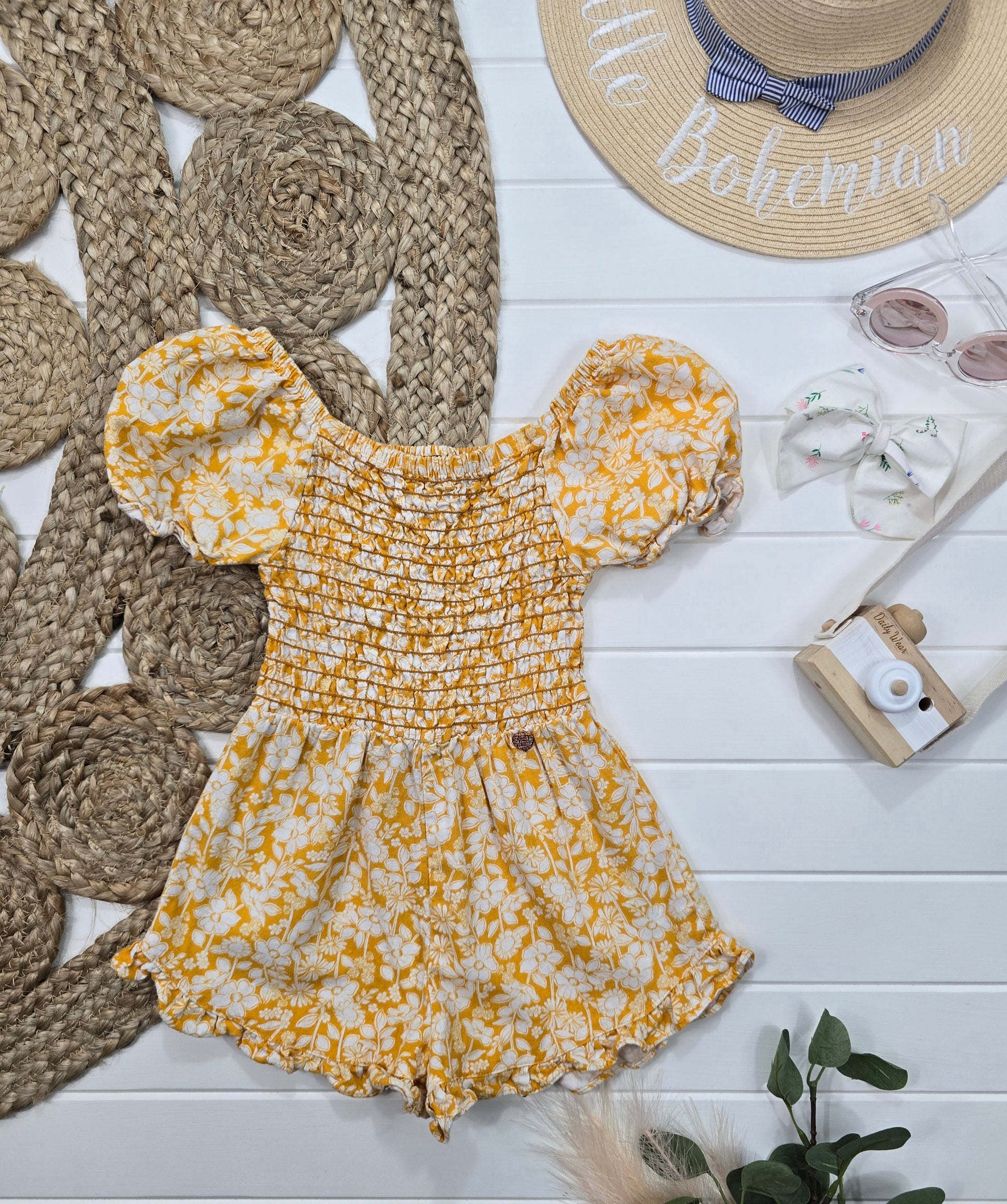 Le combishort Vince Camuto pour enfant de 6 ans offre une touche de jaune éclatante et un motif fleuri blanc. Ce combishort non extensible est idéal pour les journées d'été ensoleillées et ajoute une touche de style à la garde-robe de votre enfant. Confortable et élégant, ce combishort est un must-have pour les aventures en plein air.