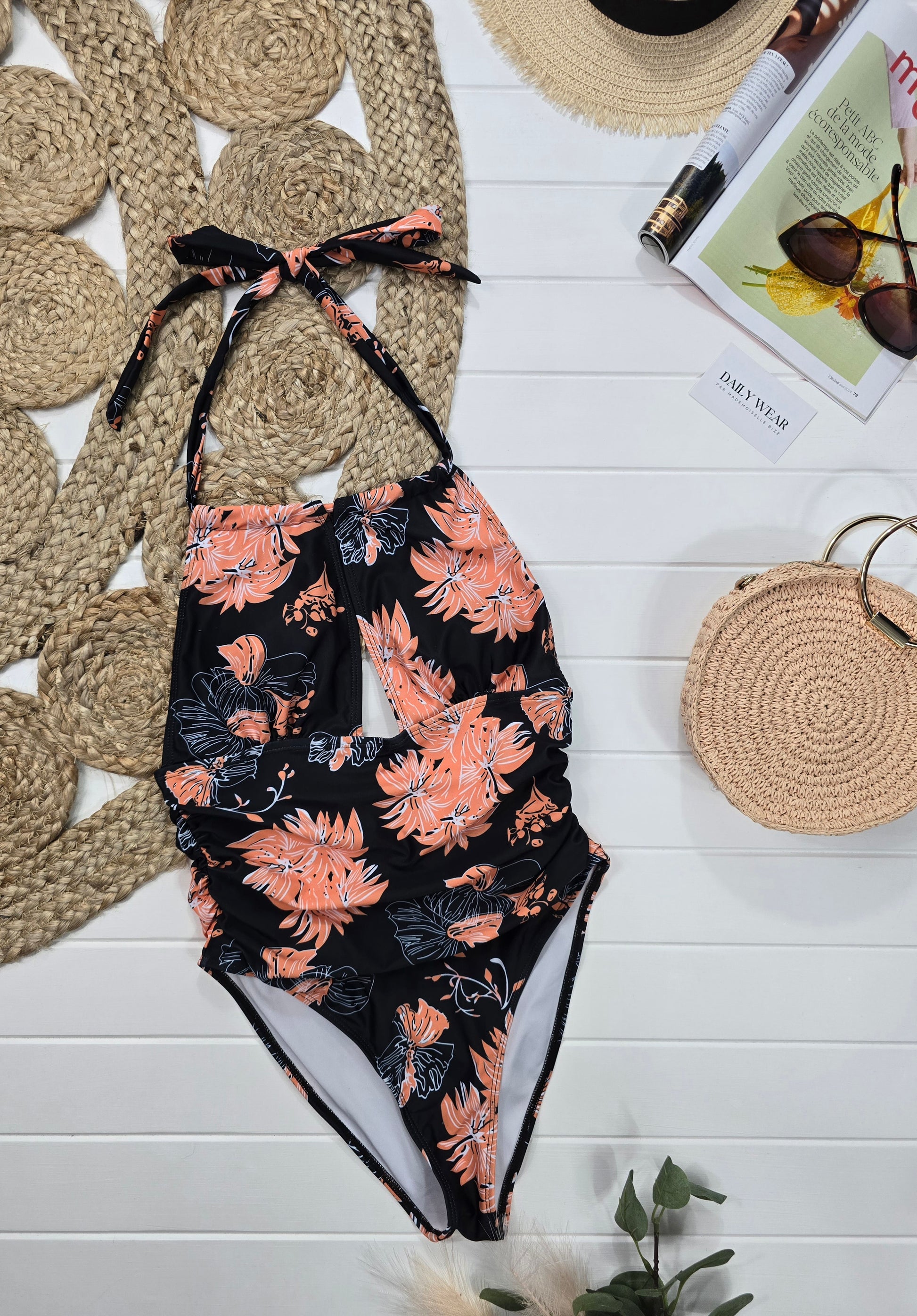 Ce costume de bain noir, en taille médium, est parfait pour la plage ou la piscine. Avec son motif de fleurs orange et blanc, il ajoute une touche de couleur à votre tenue. Le tissu noir est confortable et durable, pour une baignade sans soucis.