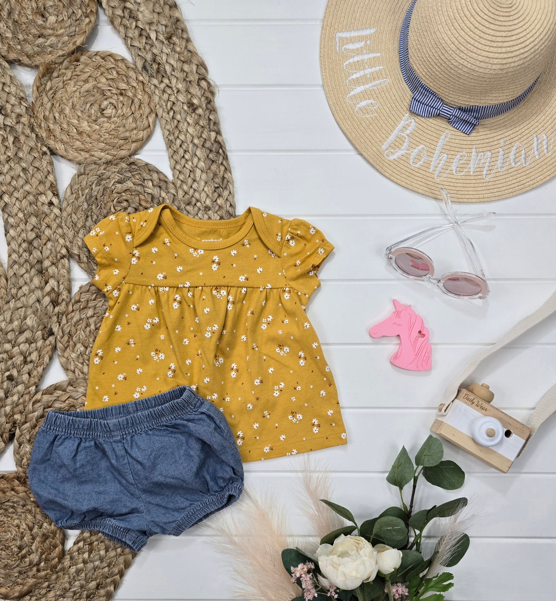 Cet ensemble Carter's, pour bébés de 3-6 mois, comprend un haut jaune avec des fleurs blanches ainsi qu'une culotte en jeans. Avec son mélange de couleurs et de matériaux, votre bébé sera à la fois confortable et stylé. Parfait pour toutes les occasions printanières.