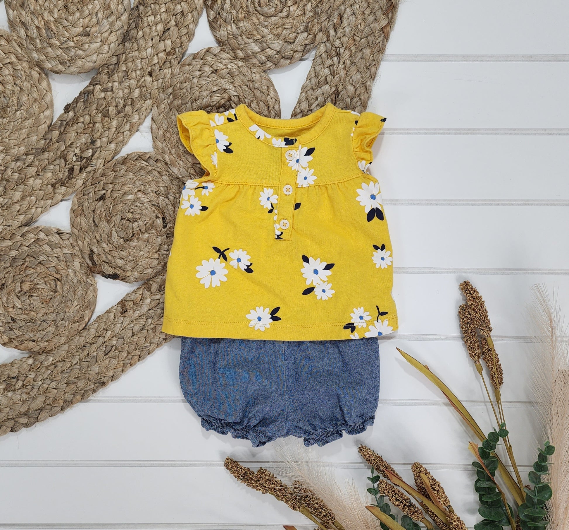 Cet ensemble Carter's pour bébé de 3 mois comprend un haut fleuri jaune et un bloomer en jeans. Le haut en coton doux offre un confort optimal pour bébé tandis que le bloomer en jeans ajoute une touche de style. Parfait pour une tenue décontractée et mignonne.