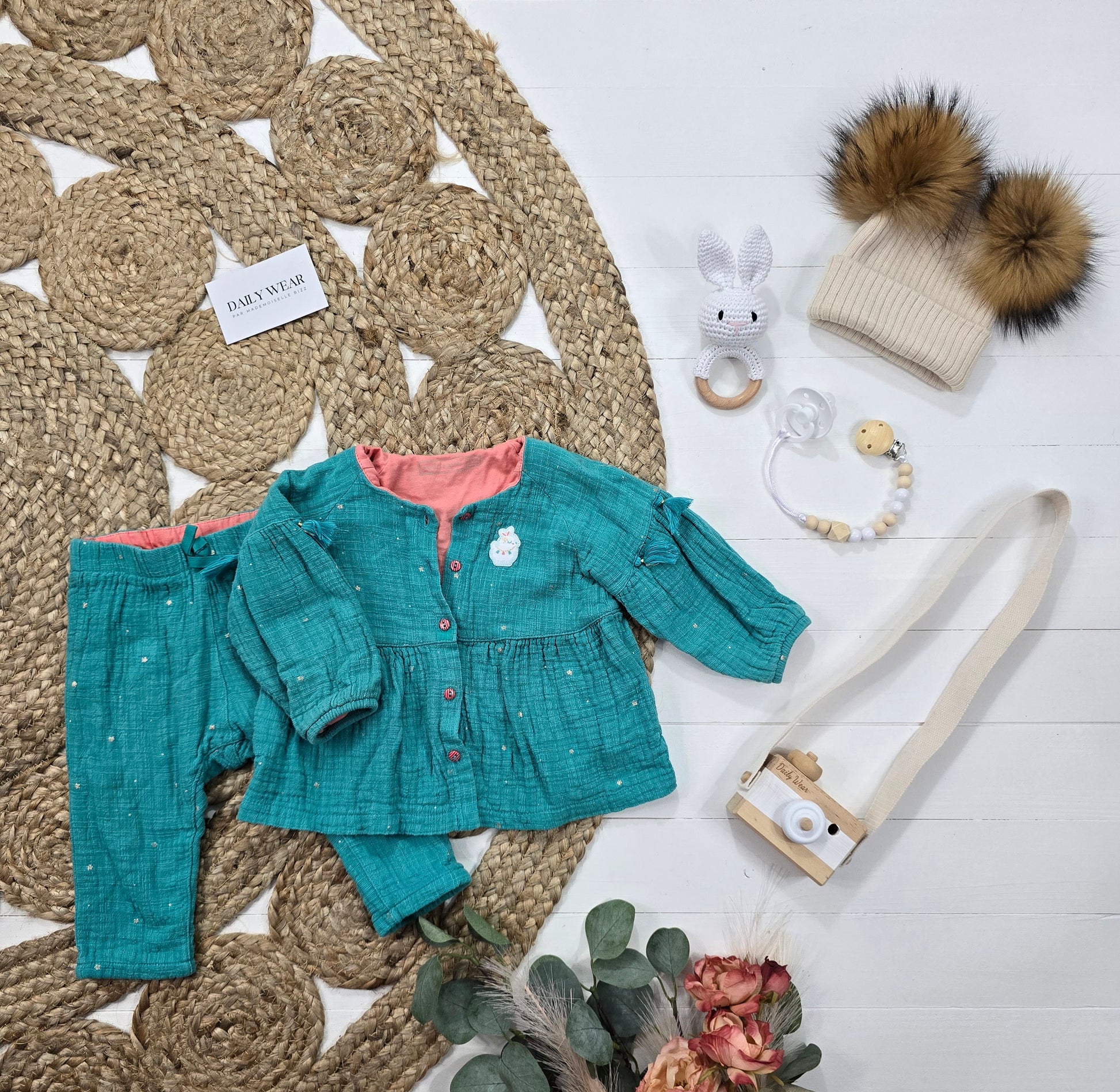 Pour un look mignon et original, habillez votre tout-petit avec notre Ensemble Souris Mini! En turquoise et rose avec de jolis pompons aux épaules et des étoiles dorées, votre bébé sera à croquer. Parfait pour les bébés de 9 à 12 mois. (Parfait pour les bébés branchés!)