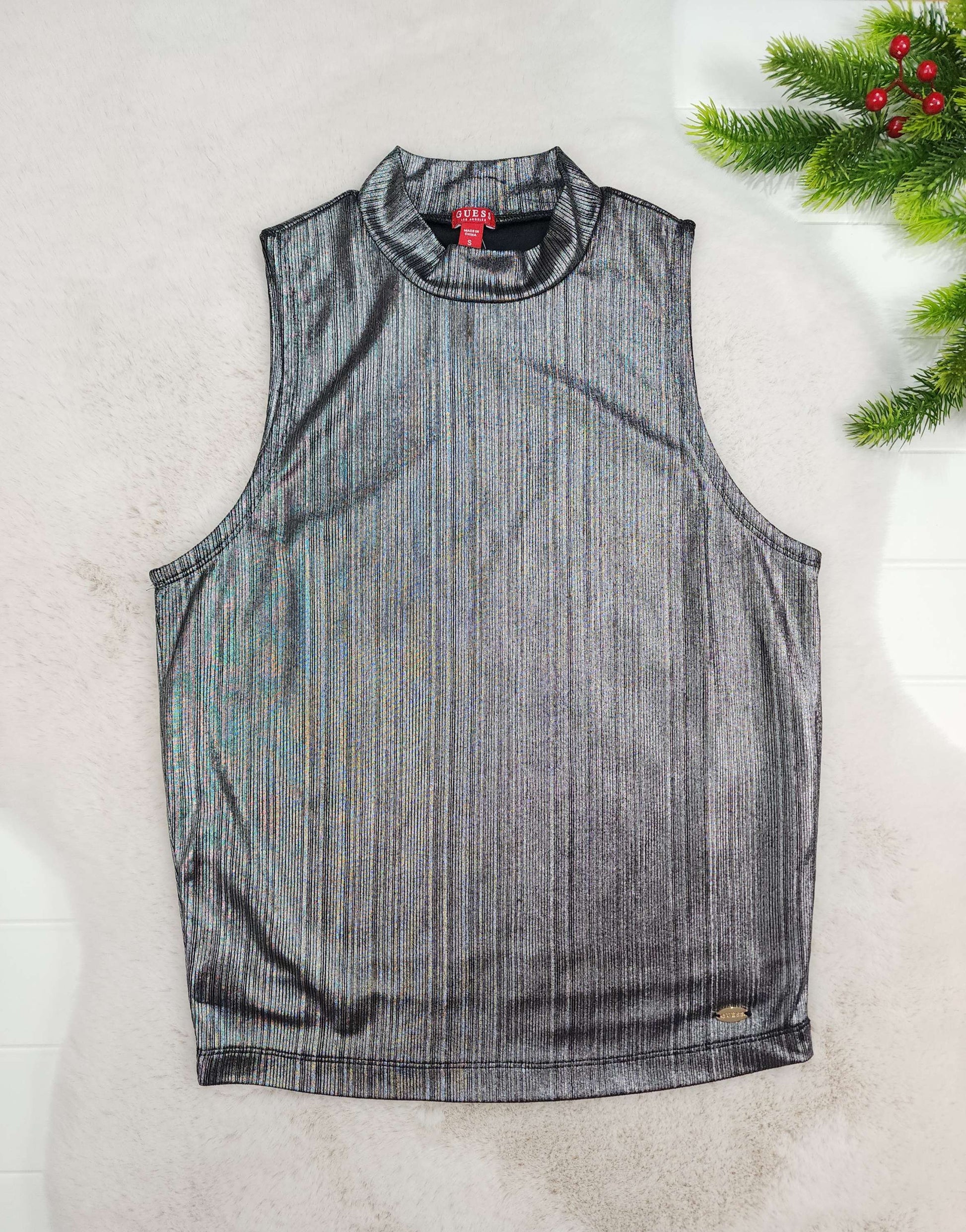 Découvrez le haut sans manche demi col de Guess, avec sa couleur argent qui ajoute une touche funky à votre look. Conçu pour les tailles petites, il souligne subtilement vos épaules et vous donne un air de cool (sans les manches !). Sans doute votre nouveau haut préféré.