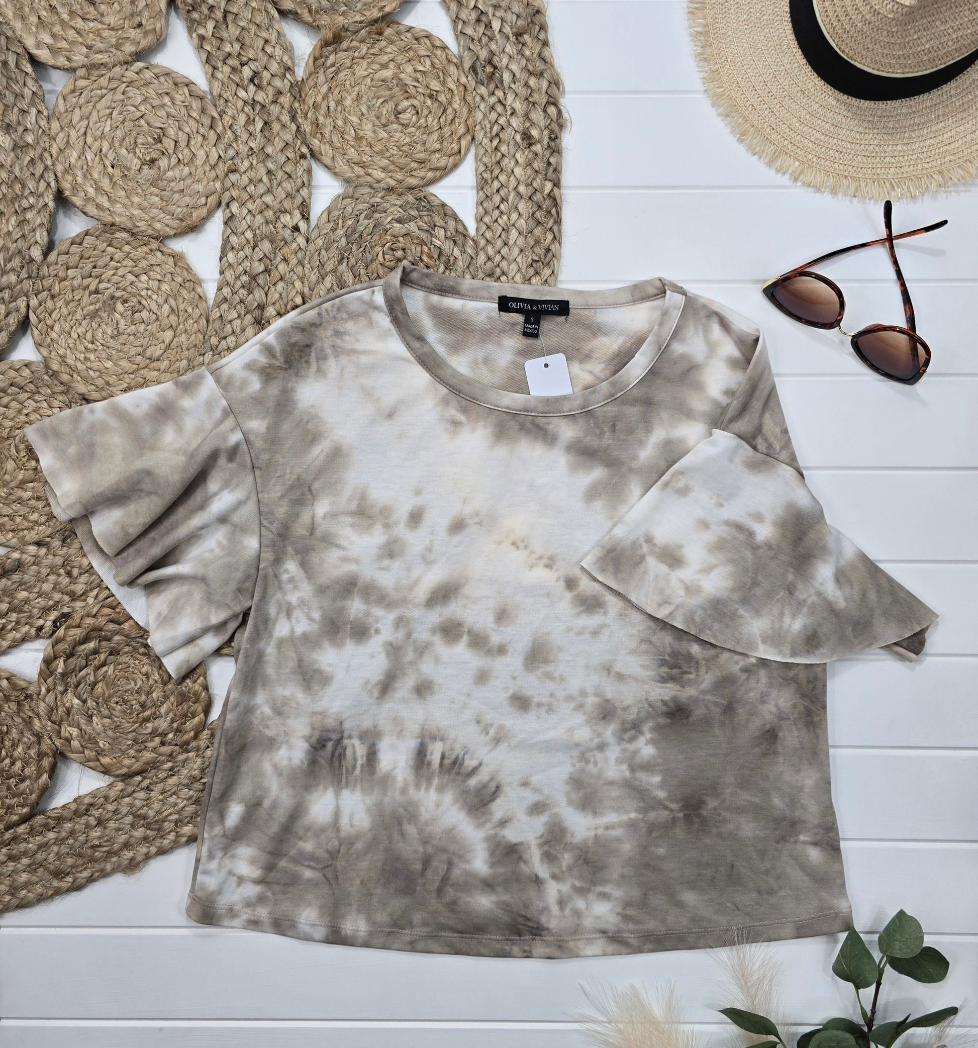 Découvrez notre magnifique haut Olivia & Vivian, Small, aux manches évasées et au motif tie-dye blanc et beige. Neuf et tendance, ce haut ajoutera une touche unique à votre garde-robe. Soyez prêt à faire tourner les têtes avec style et originalité !