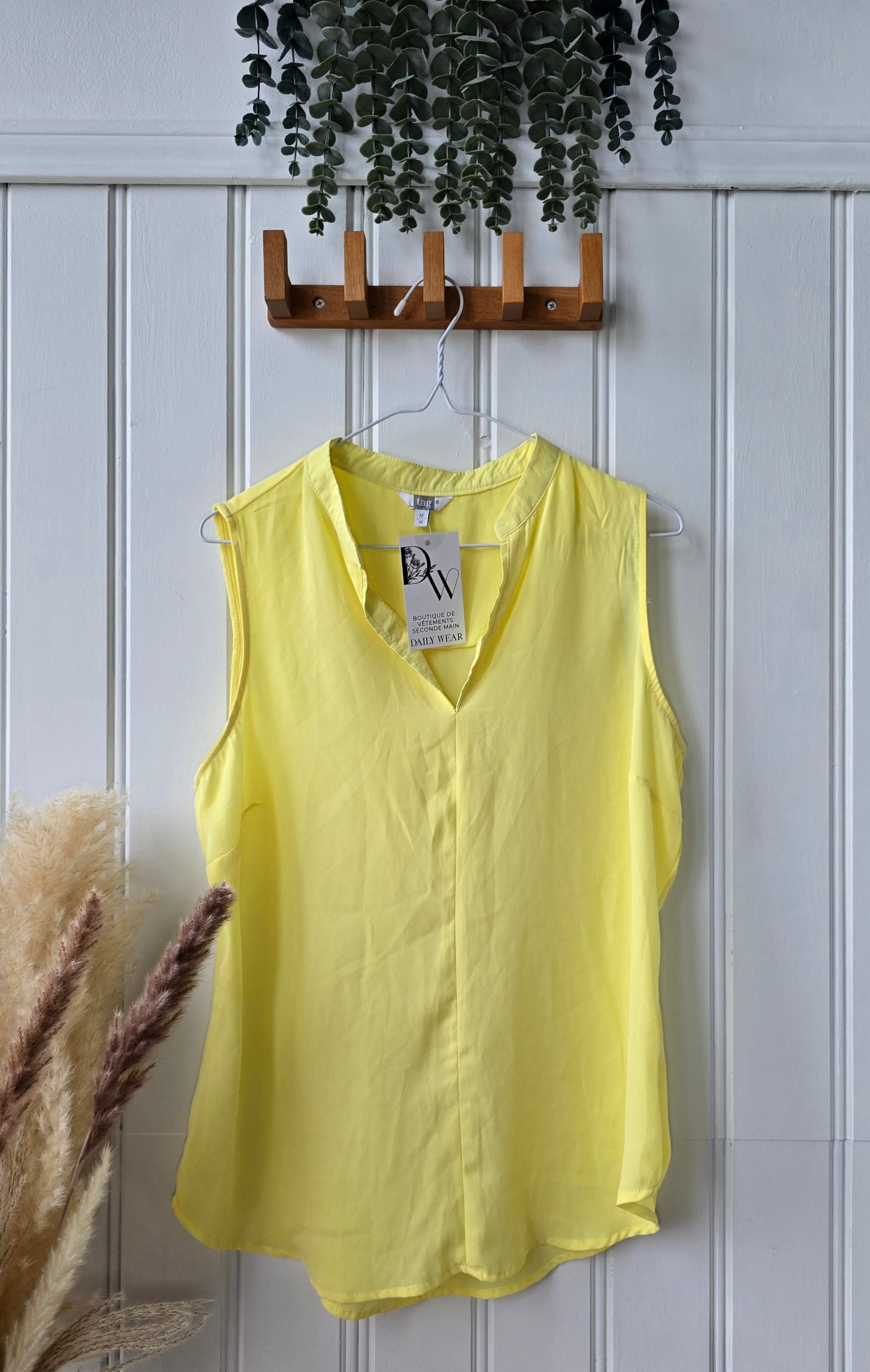 Apportez une touche de soleil à votre garde-robe avec notre haut Tag en tissu de voilage jaune éclatant! Léger et aérien, il vous gardera au frais et ajoutera une touche de couleur à votre style. Idéal pour une journée ensoleillée ou pour ajouter un peu de gaieté à votre tenue.