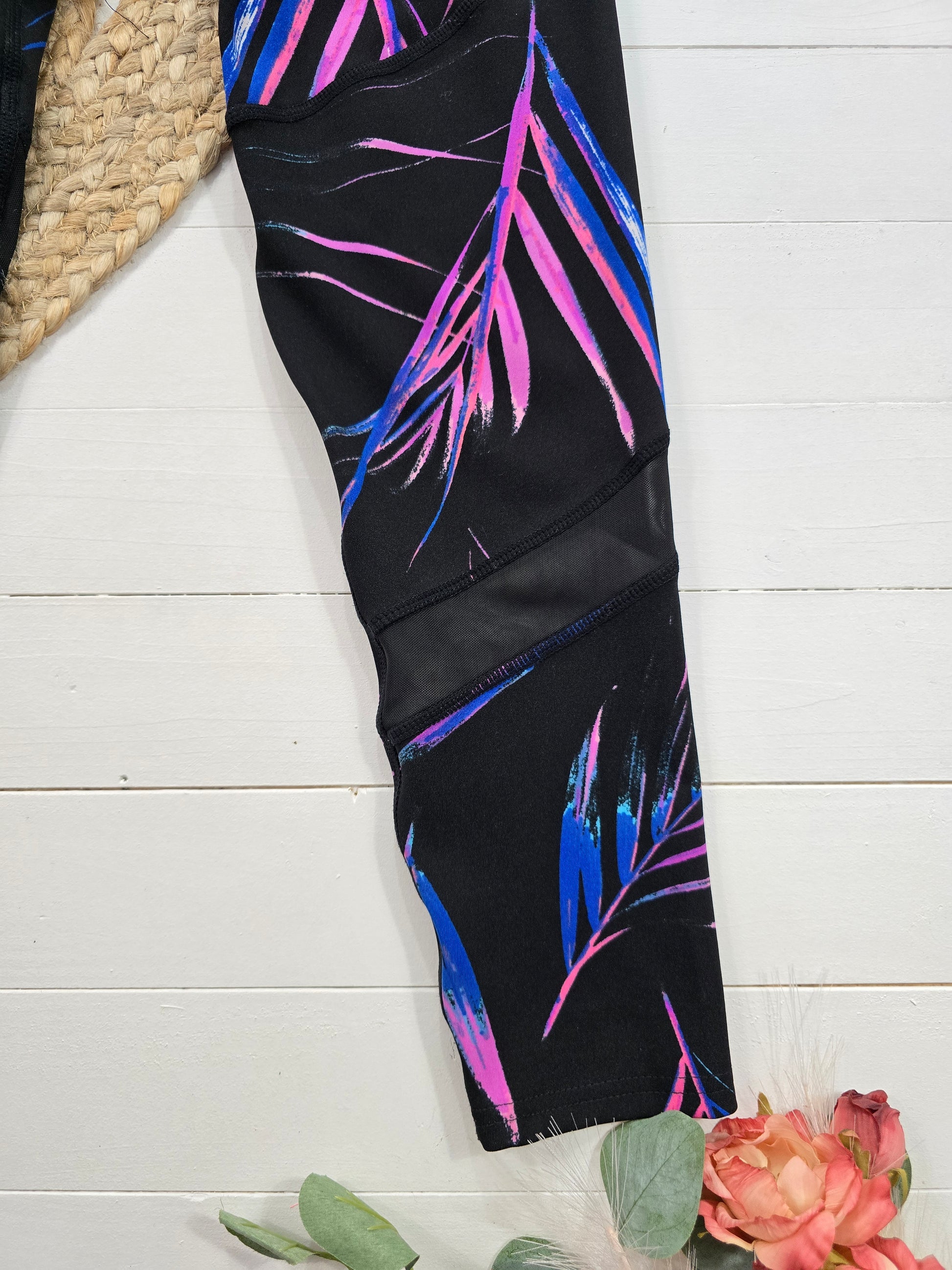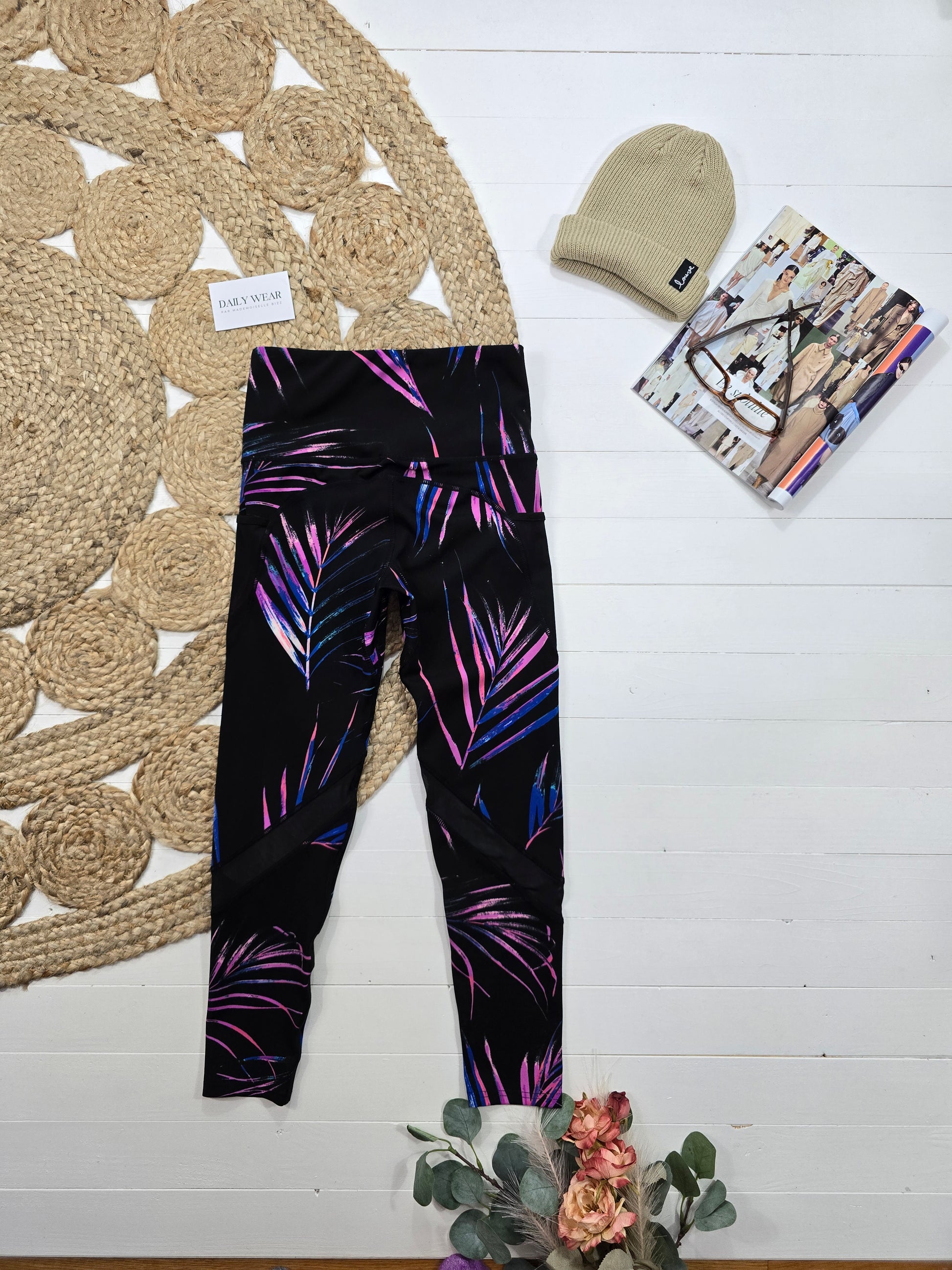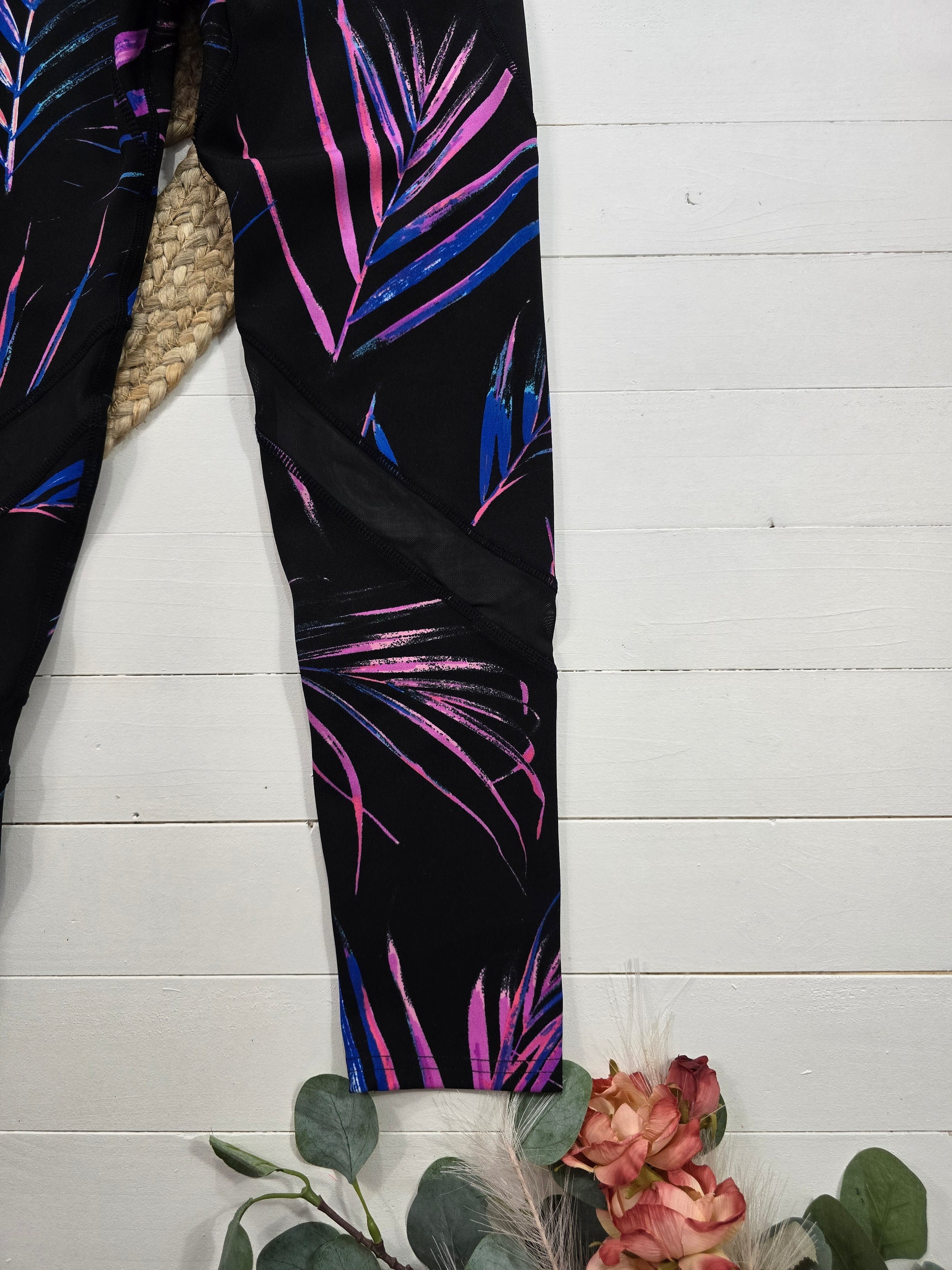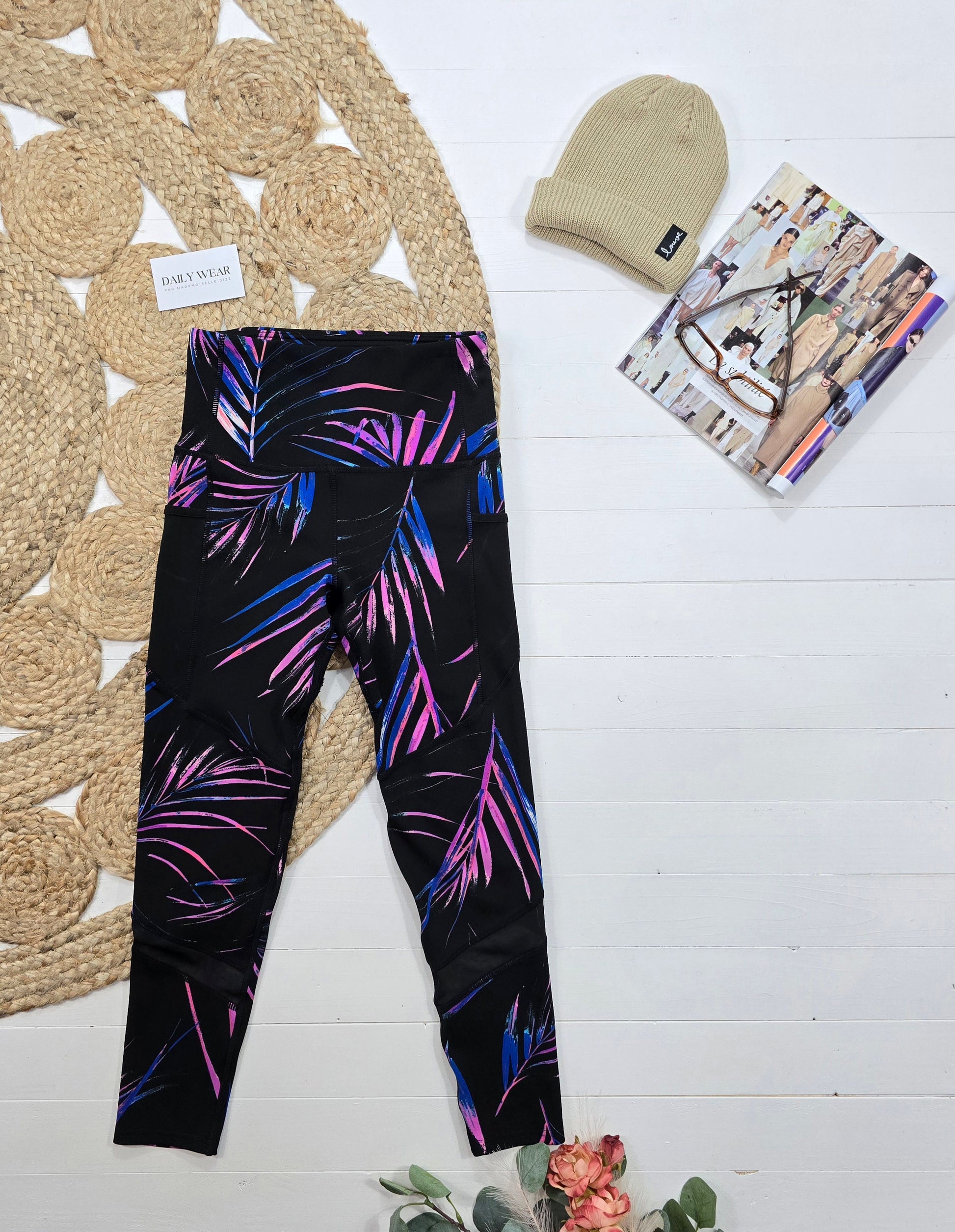 Ces legging Ardène combinent le noir avec des motifs de feuille rose et bleu, créant un look unique et élégant. Les poches sur les côtés ajoutent un aspect pratique et fonctionnel, tandis que la bande transparente sur les jambes apporte une touche de style. Parfait pour allier confort et tendance.