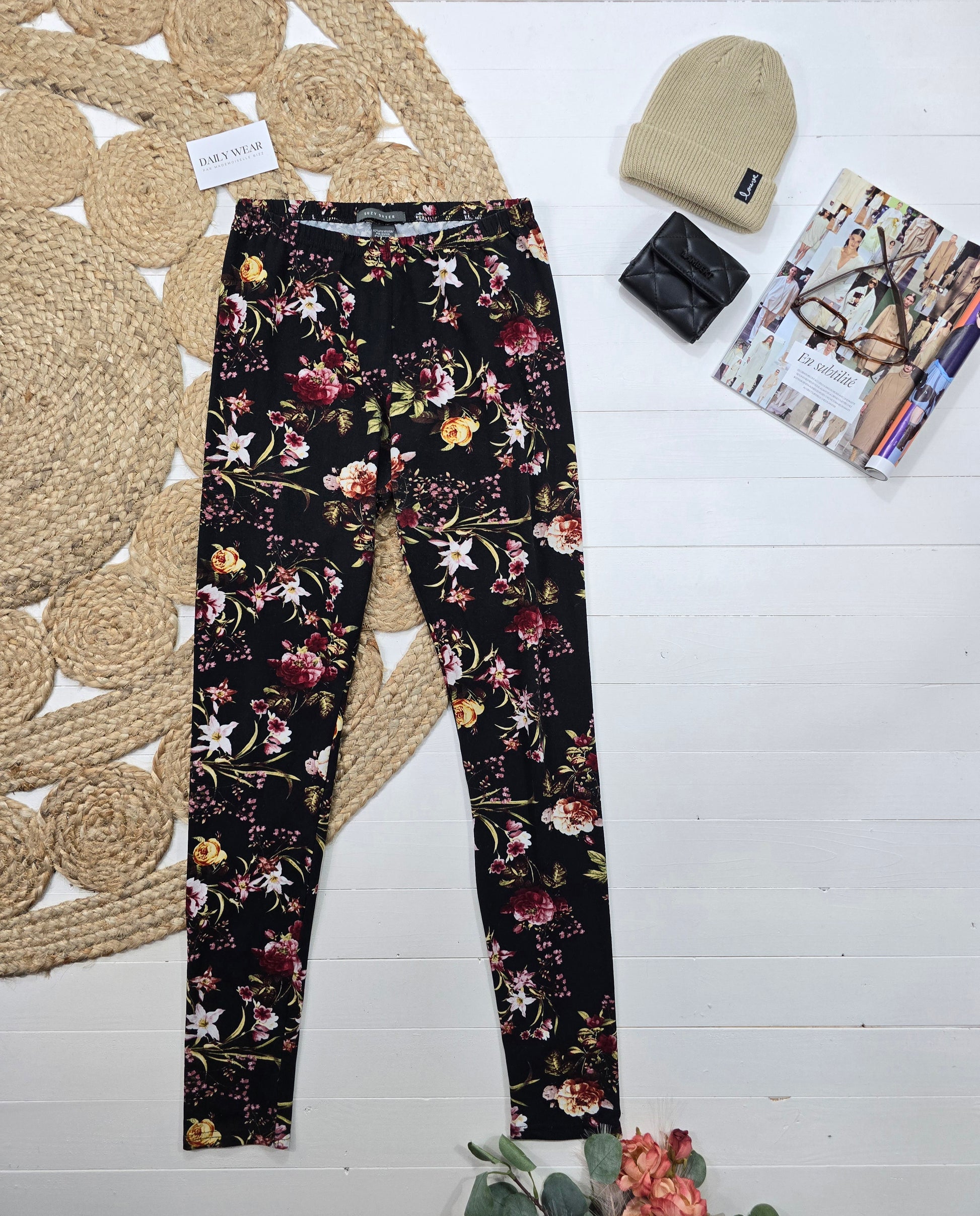 Apportez une touche florale à votre garde-robe d'automne avec ce legging médium de Suzy Shier en noir avec des motifs de fleurs colorés. Un mélange parfait de confort et de style pour tous vos looks décontractés. (Fleurs non incluses).