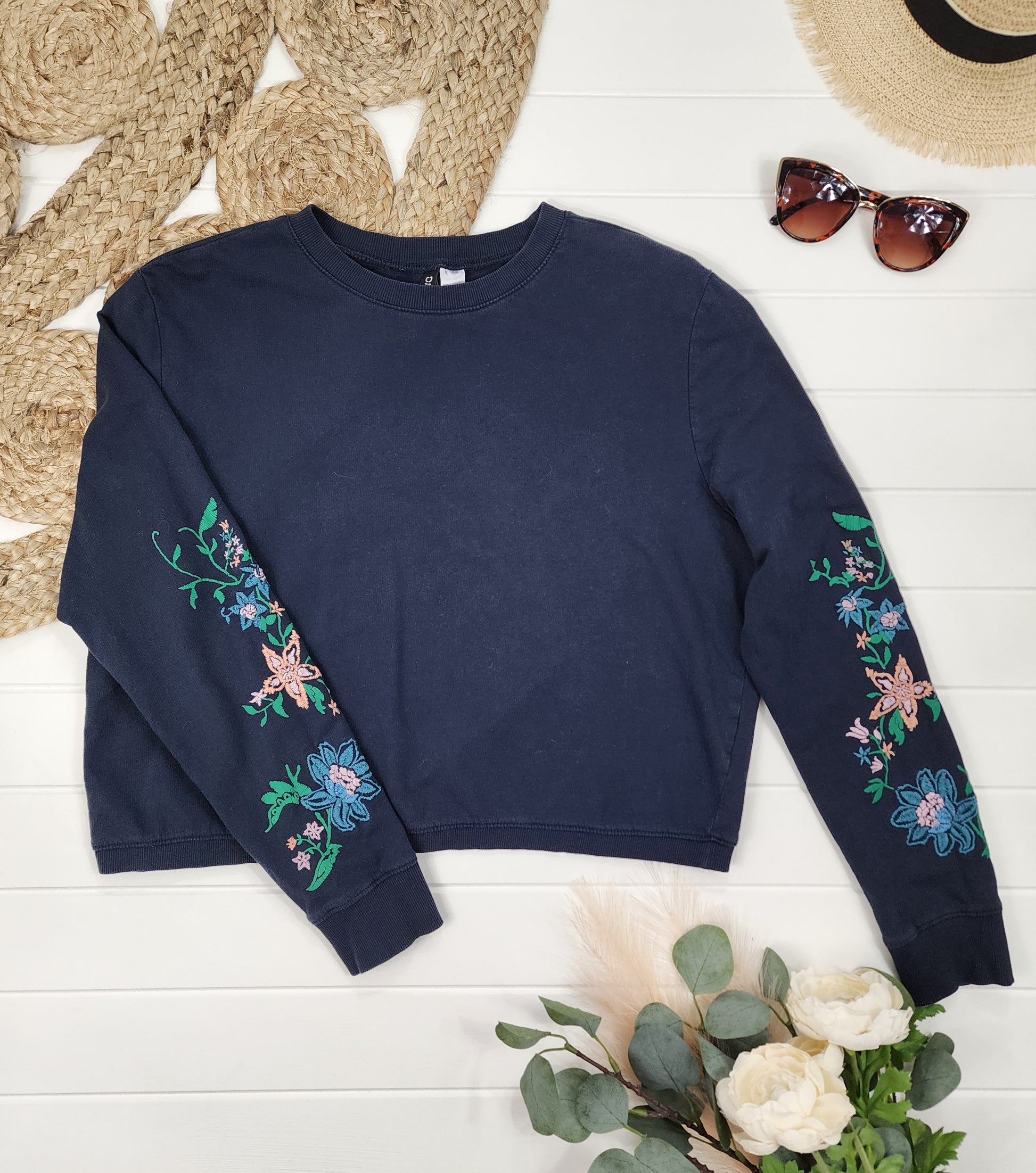 Ce chandail H&M, avec des fleurs délicates sur les manches, est parfait pour rajouter une touche de féminité et d'élégance à n'importe quelle tenue. Fabriqué avec des matériaux de qualité, ce chandail vous offrira confort et style en même temps. Un incontournable pour votre garde-robe.