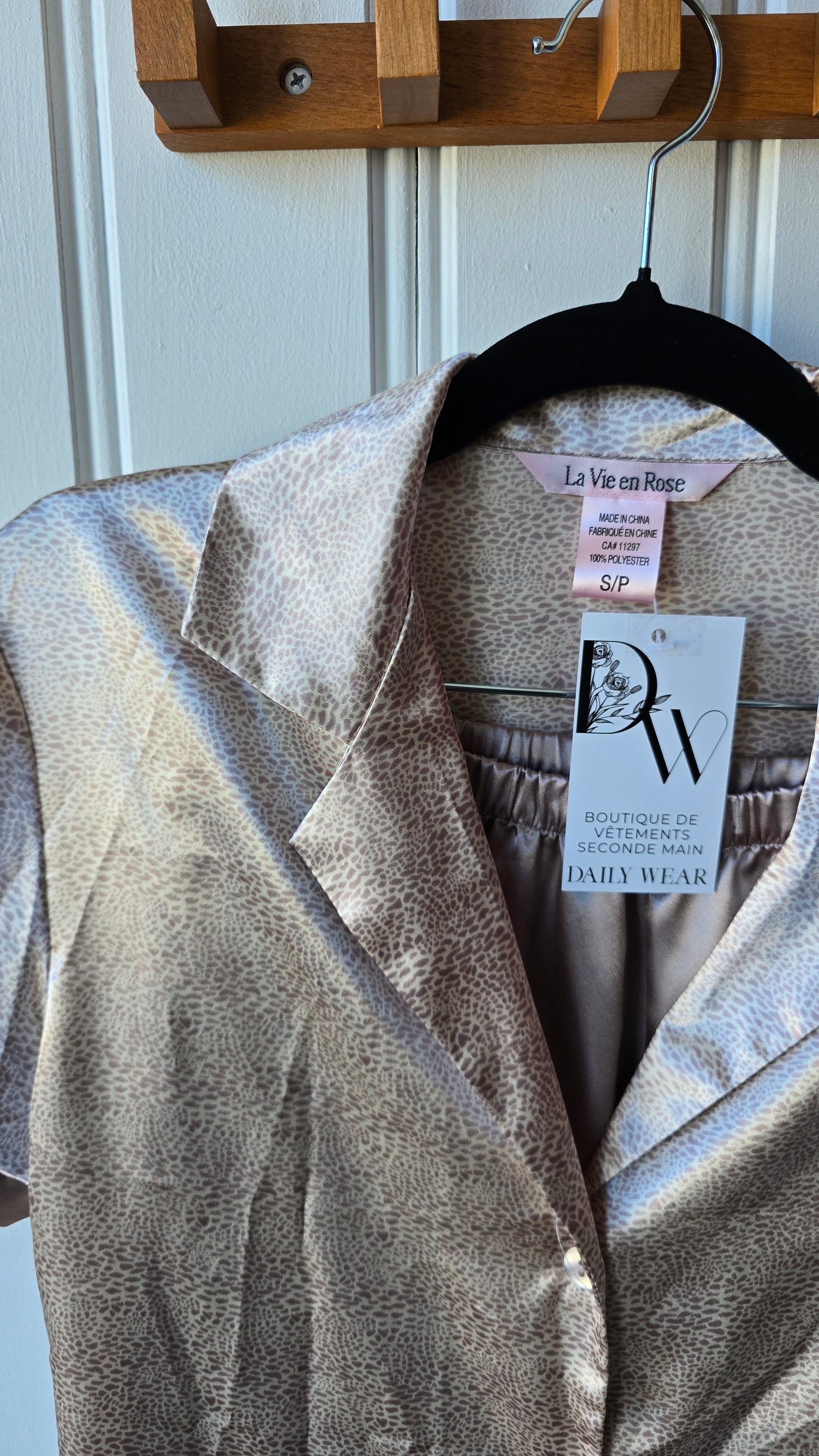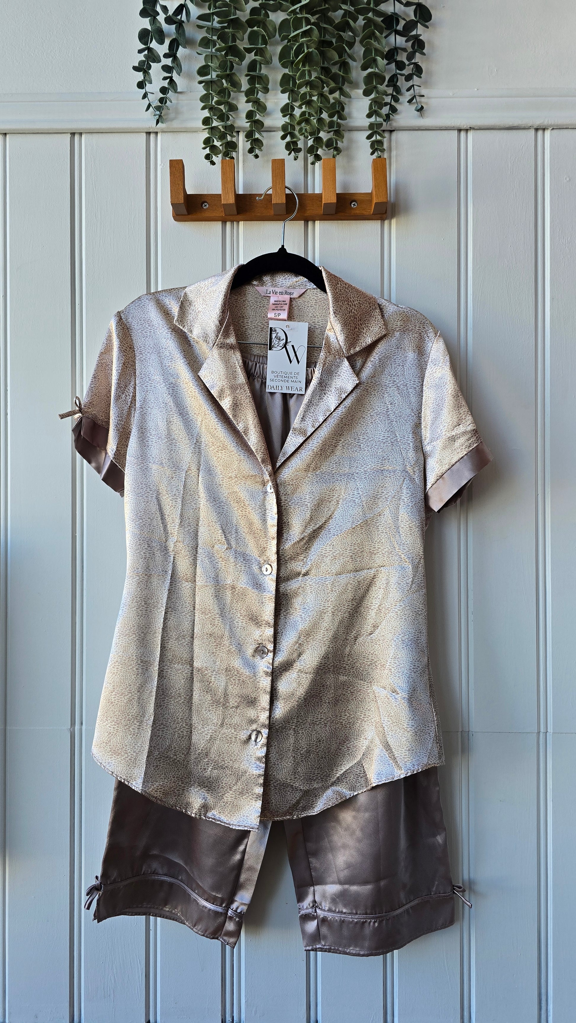 Profitez d'une nuit de sommeil luxueuse avec le pyjama La Vie en Rose en satin beige. Avec des manches courtes et un pantalon capri, vous vous sentirez à la fois confortable et élégante. Offrez-vous le sommeil dont vous méritez avec ce pyjama haut de gamme.