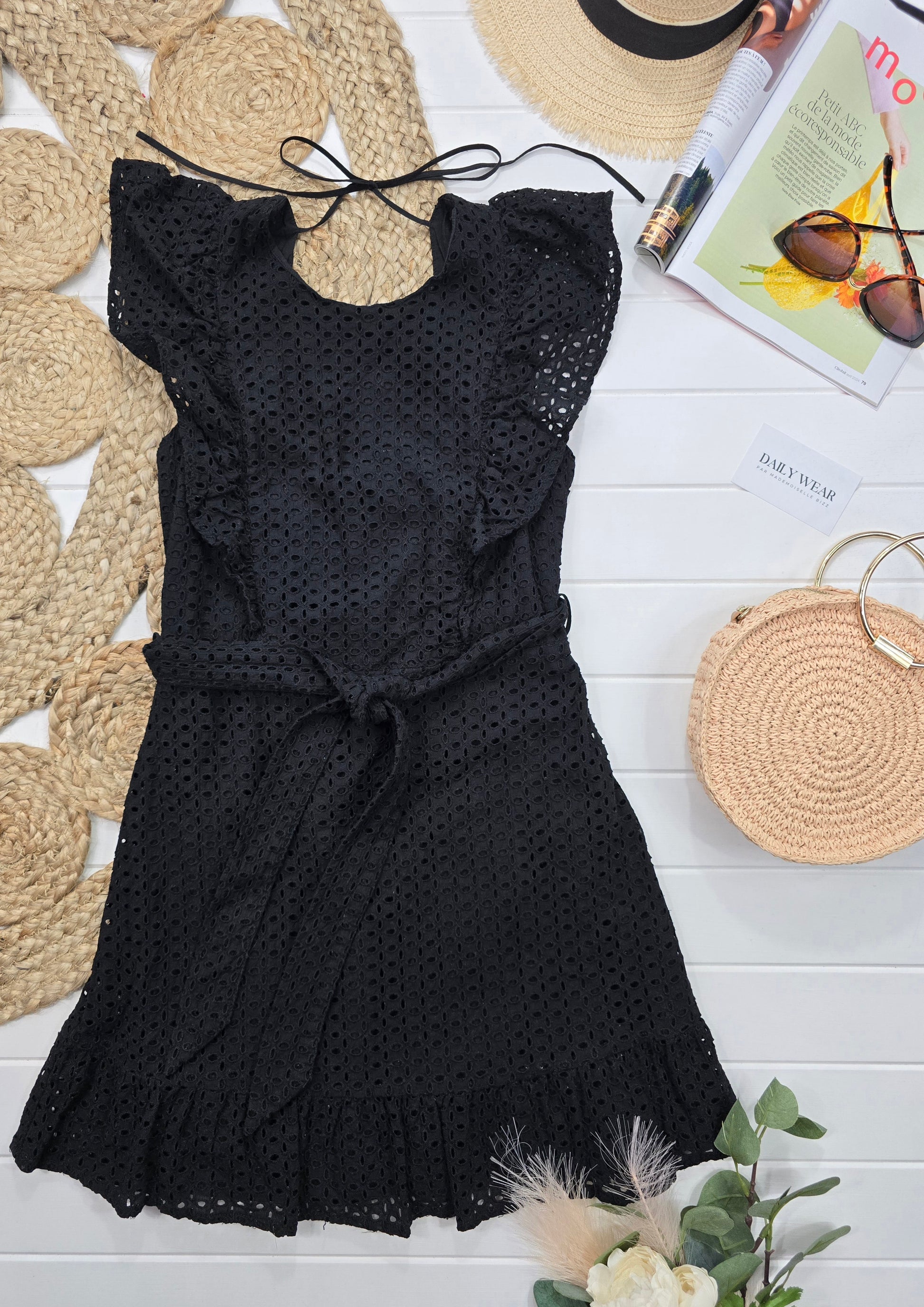 Cette robe Dynamite est la touche de charme et de finesse qu'il manquait à votre garde-robe. Avec son tissu noir non extensible et ses froufrous aux épaules, elle vous offre confort et élégance. Son motif troué ajoute une touche de modernité et son détail ceinturé met en valeur votre silhouette. Idéale pour toutes les occasions.