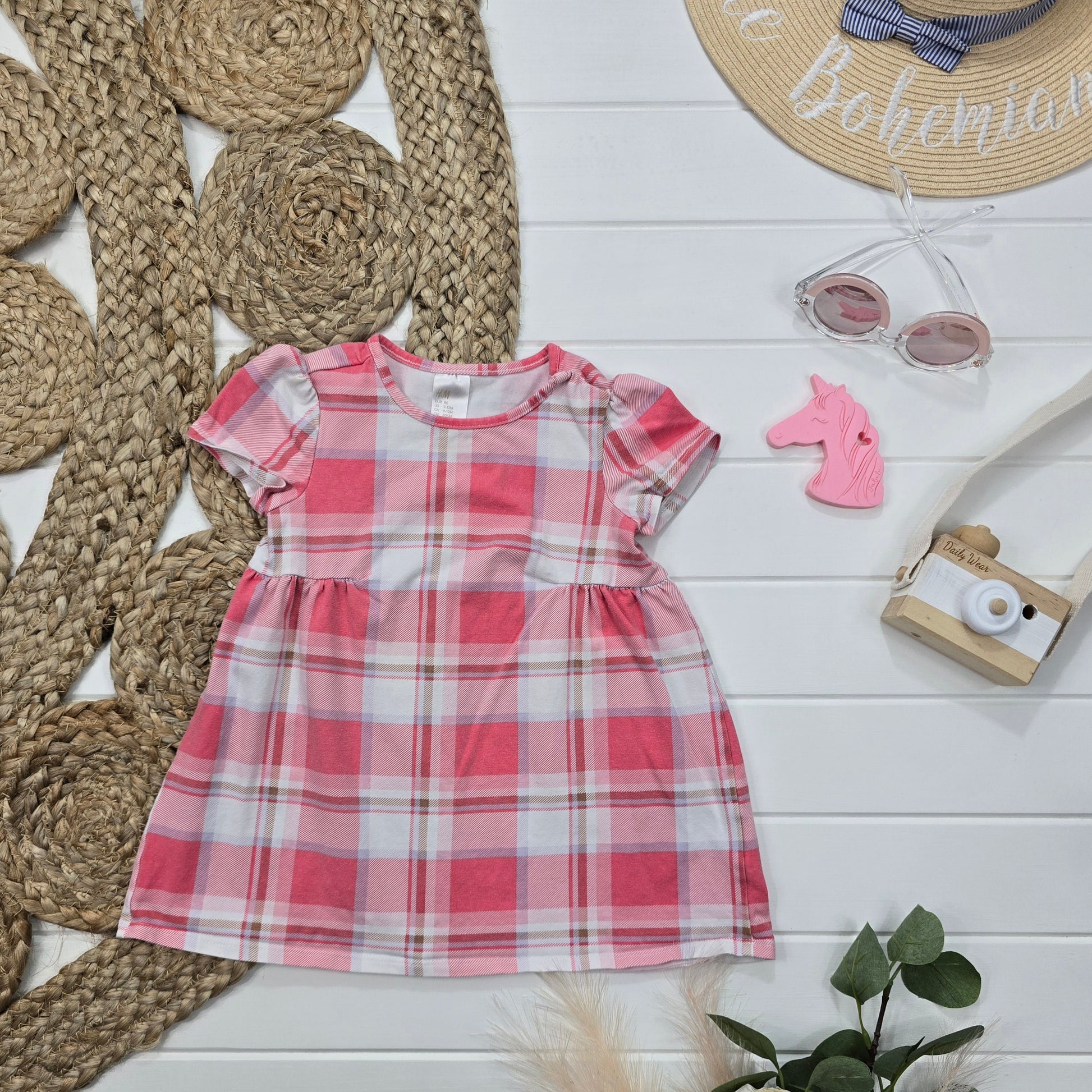 La robe H&M, taille 9-12 mois, est l'ajout parfait à la garde-robe de votre bébé. Carreautée rose, blanc et beige, elle apporte une touche de douceur et de style à toutes les occasions. Confortable et tendance, cette robe est un must-have pour tout enfant branché. (Non inclus : berceuse pour bébé.)