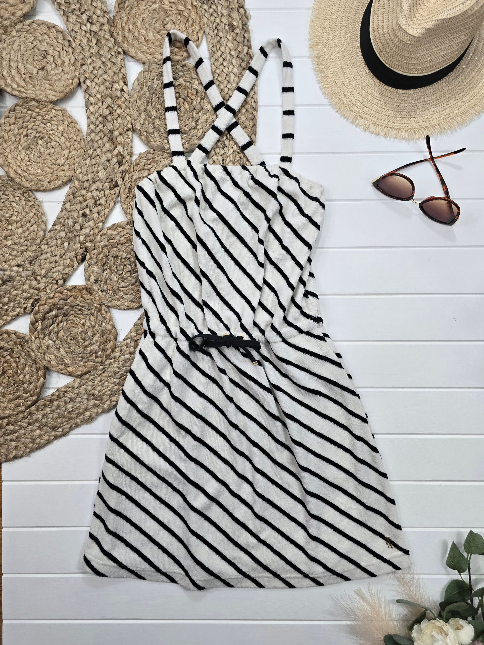 Vivez le luxe avec la Robe Juicy Couture ! Fabriquée en tissu de ratine noir et blanc, elle est parfaite pour une journée à la plage. Légère et confortable, elle vous fera vous sentir chic et décontractée. Disponible en taille Small. Ajoutez une touche de style à vos tenues d'été avec cette robe incontournable !