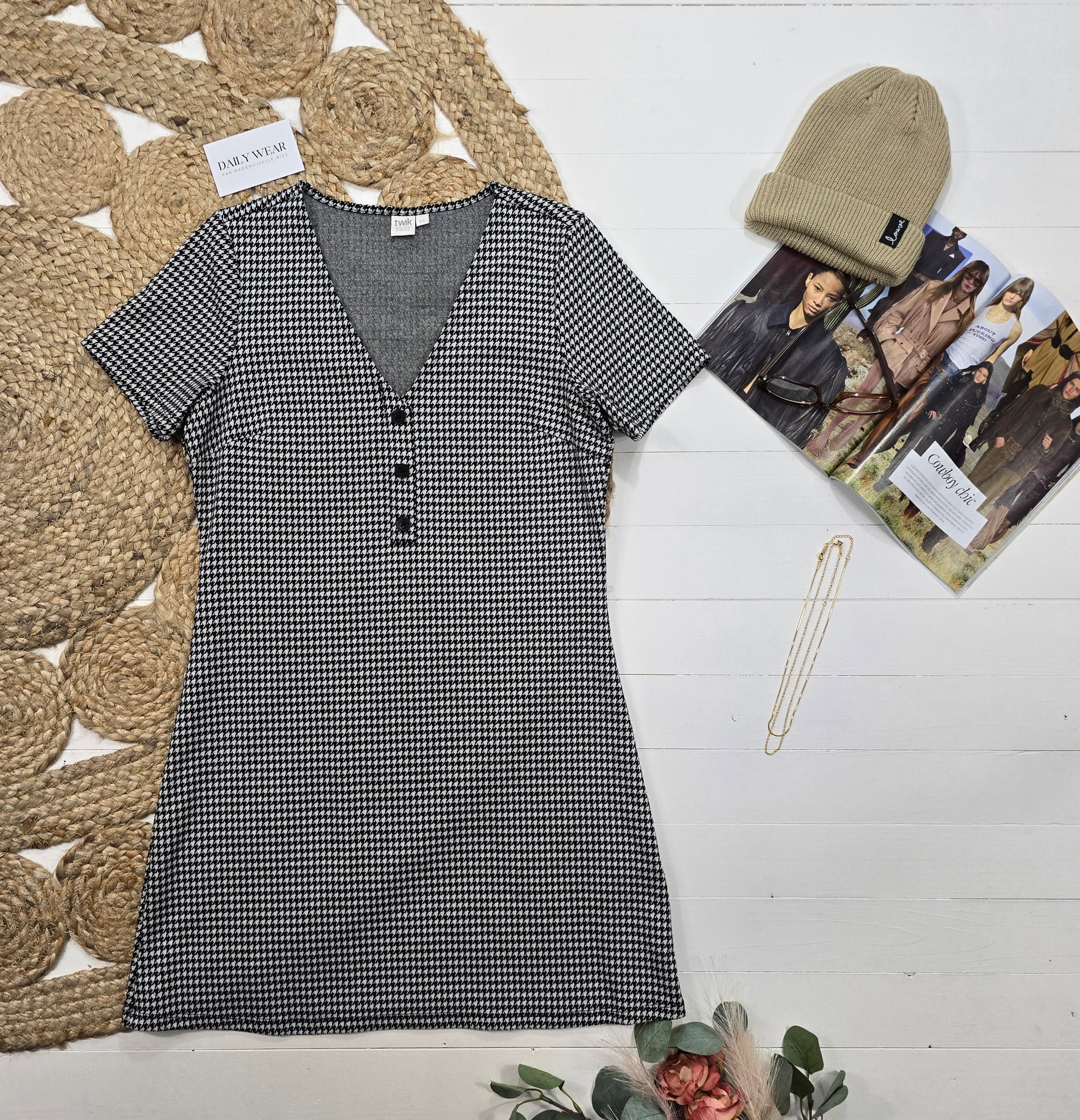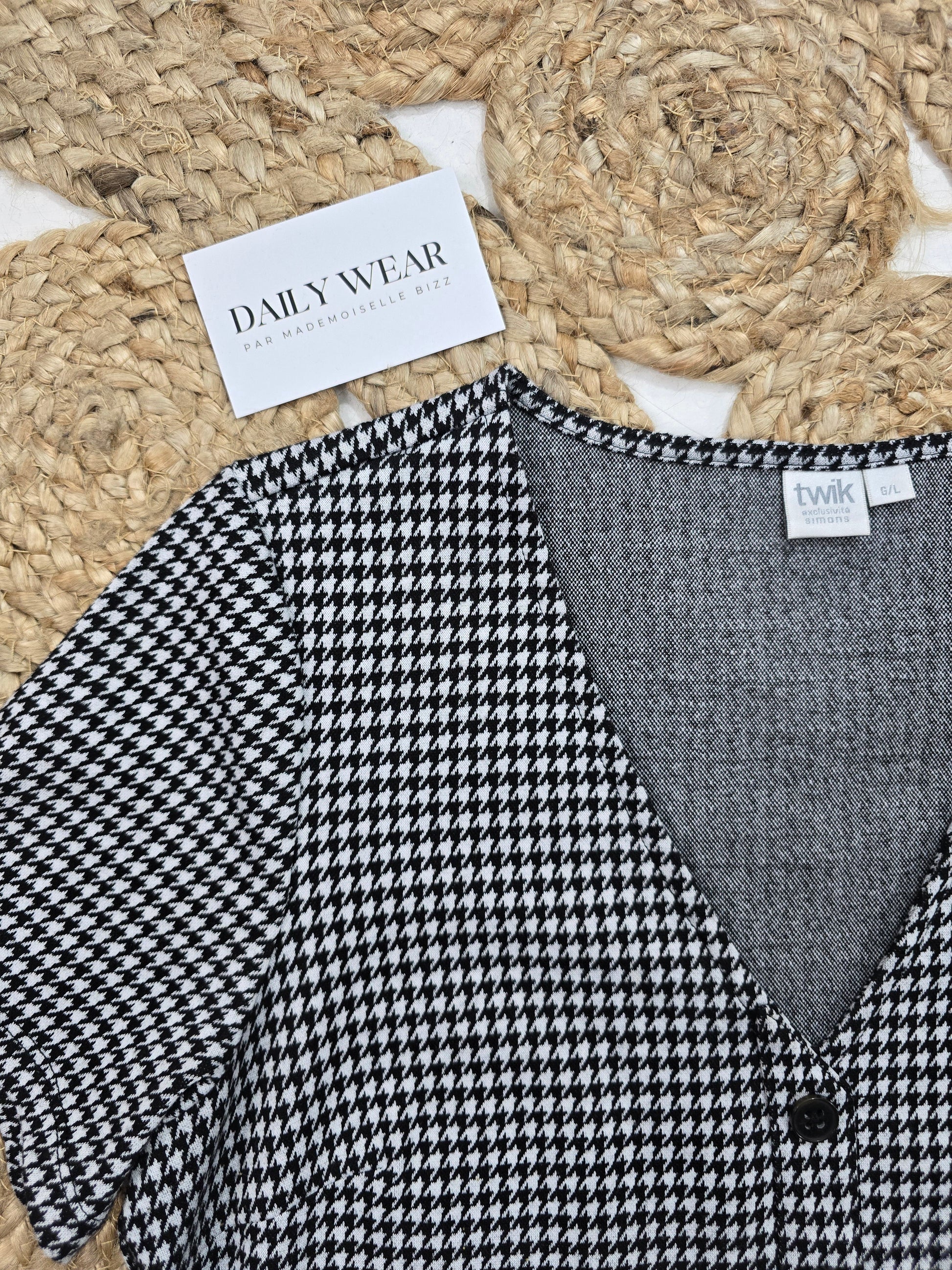 Ravissante robe Twik, taille grande. Motifs pieds de poule blanc et noir, boutons à la poitrine, tissu extensible pour un confort absolu. Une pièce originale pour un look fun et décontracté. Alliez style et confort avec cette robe Twik, parfaite pour toutes les occasions. (Pas sérieux s'abstenir!)