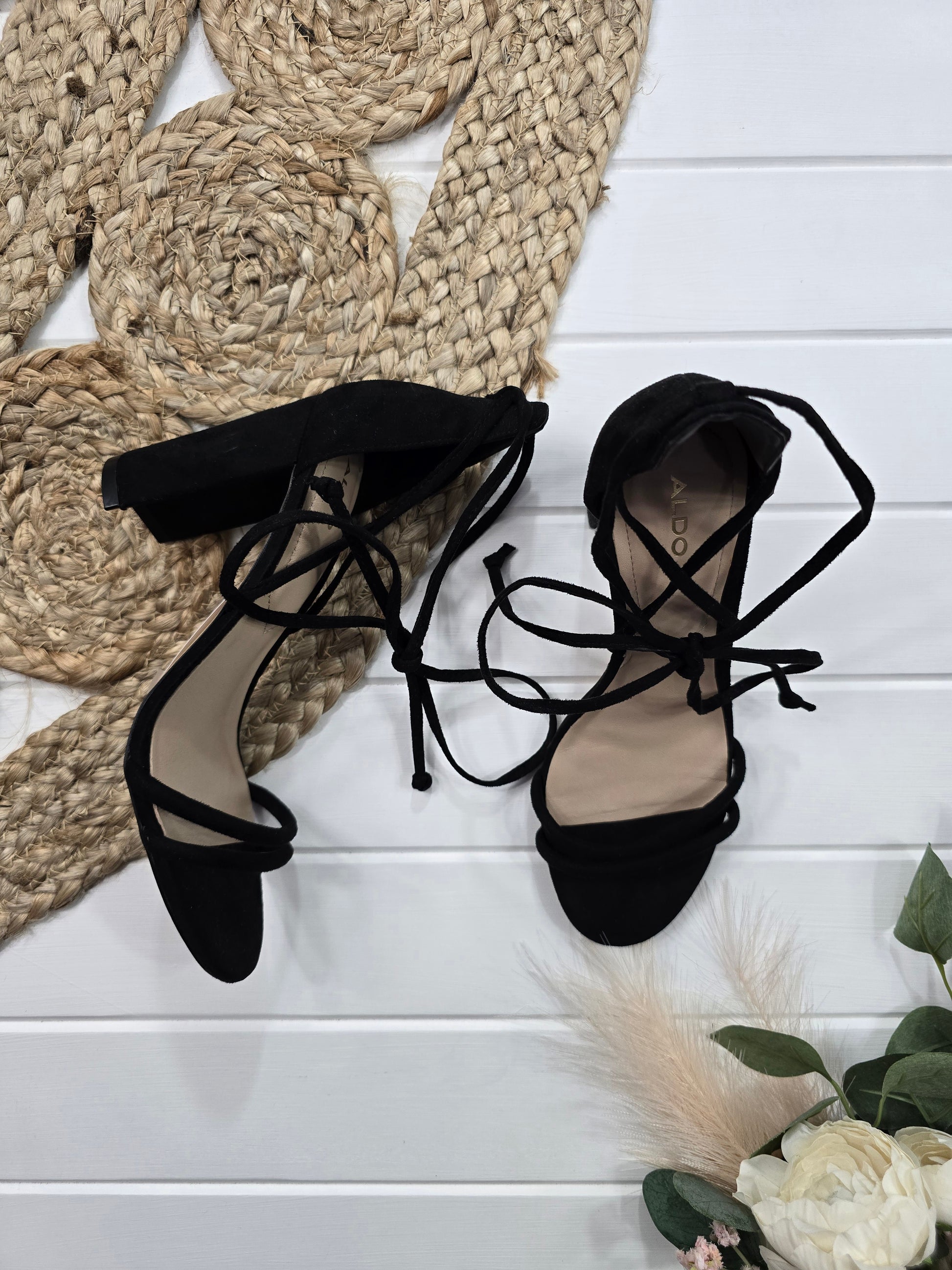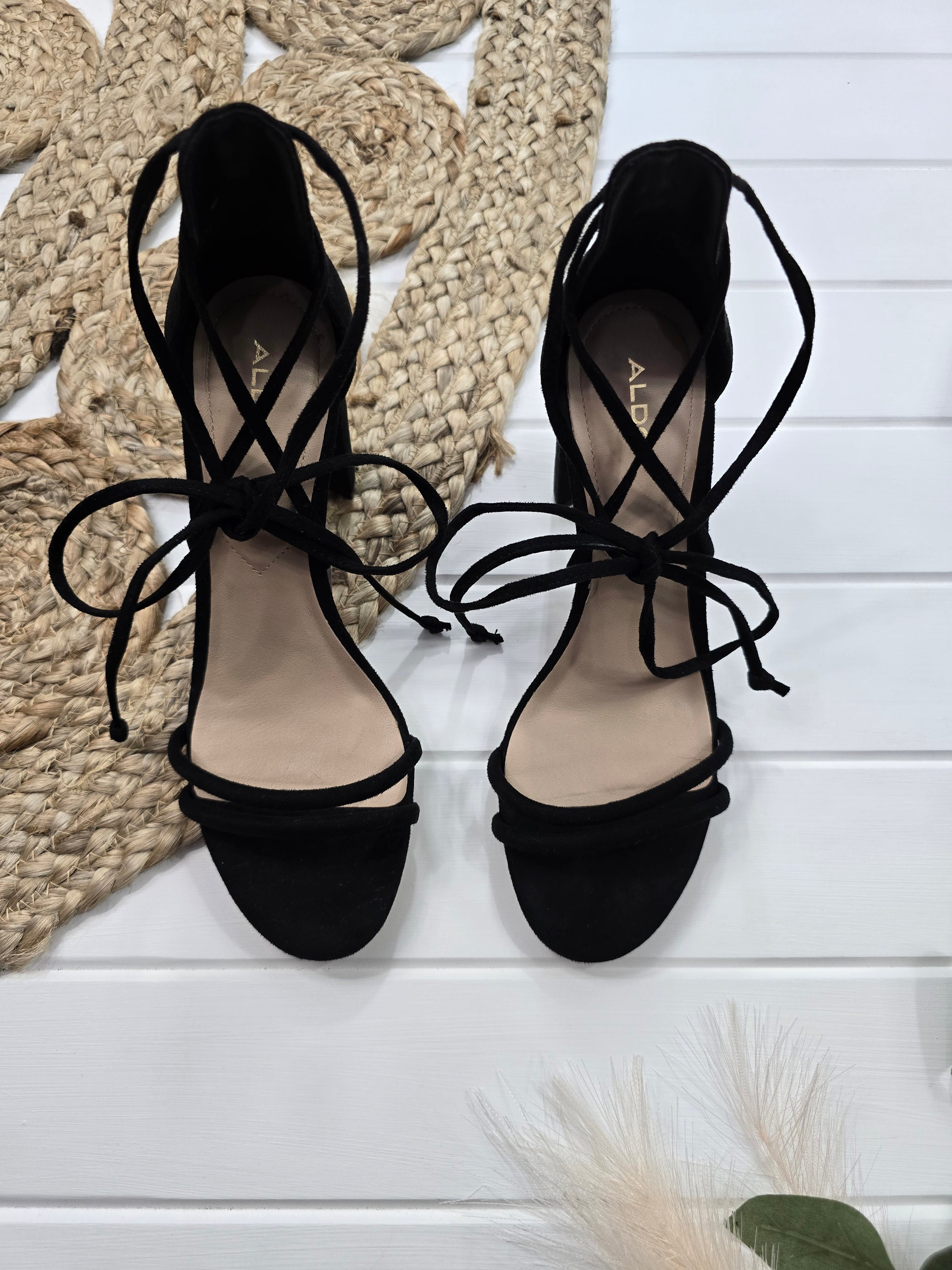 Ces sandales Aldo, taille 7.5, en suède noir offrent une allure élégante avec leur design croisé sur le dessus du pied et leurs cordons qui se nouent à la cheville. Le talon de 3 pouces et 3/4 ajoute une touche de hauteur et de féminité. Parfaites pour toutes vos occasions spéciales.