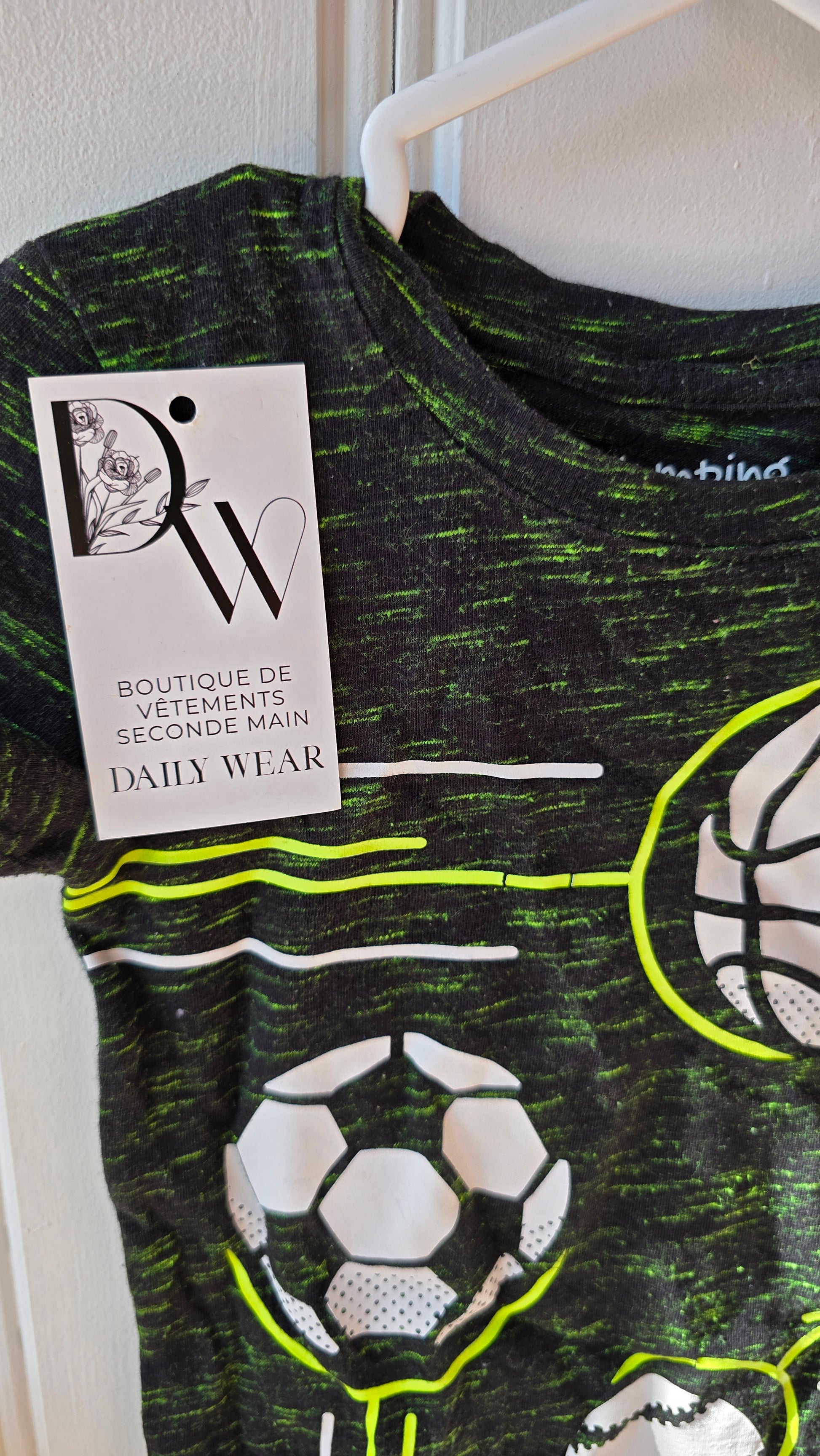 Ce T-shirt Jumping Beans pour les enfants de 2 ans est conçu pour les amateurs de sport en herbe. Avec son design noir et vert et des ballons de sport, il est à la fois élégant et amusant. Fabriqué avec des matériaux de qualité, il est confortable et durable pour des heures de jeu et d'activités physiques. Parfait pour les aventures de tous les jours et les séances de jeux en plein air.