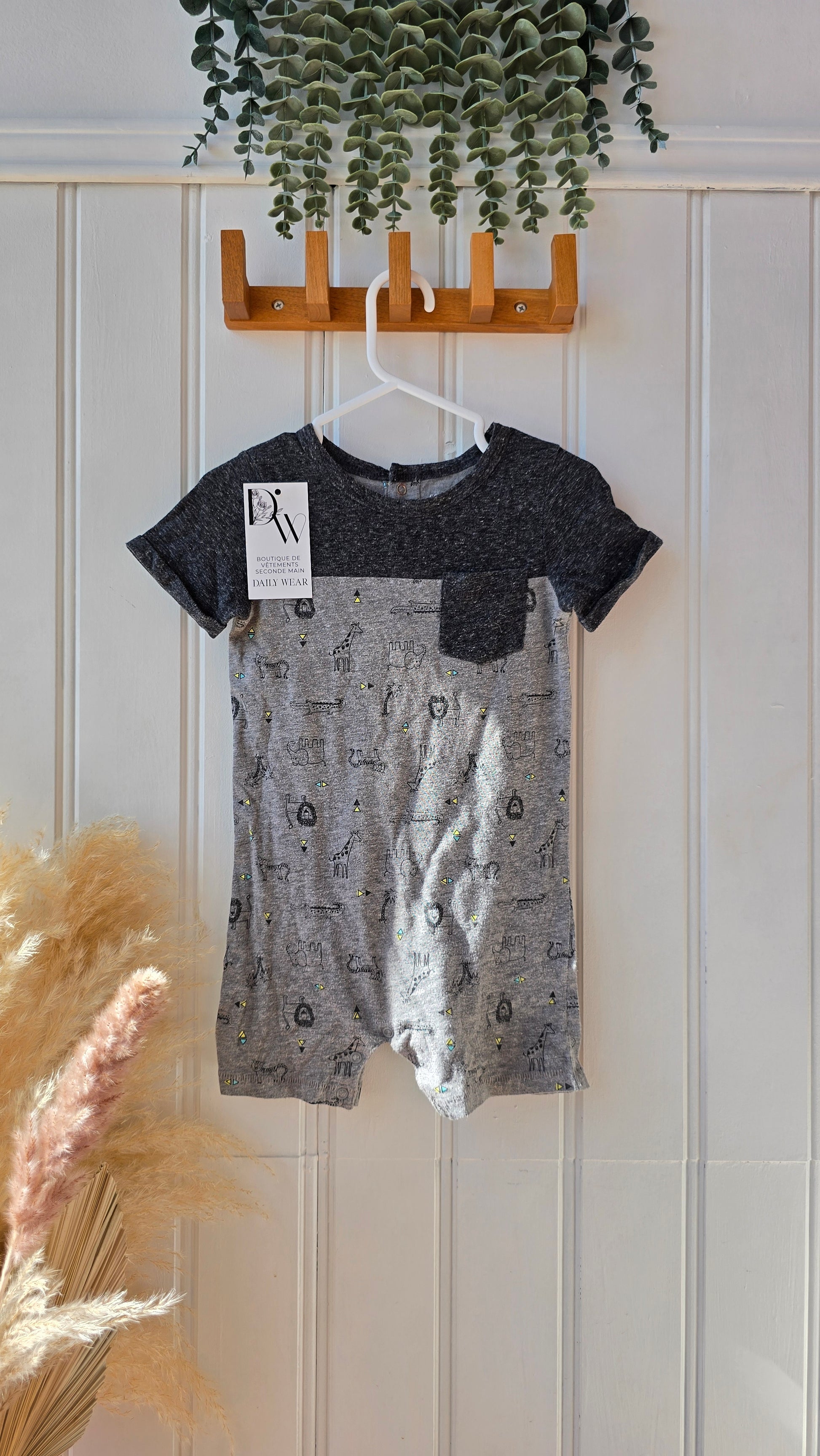 Le Combishort George est parfait pour les explorateurs en herbe. Avec ses motifs d'animaux de la jungle et ses 2 tons de gris, il éveillera l'imagination de votre enfant pendant ses aventures. Disponible en taille 18-24 mois. Optez pour le confort et le style avec le Combishort George.