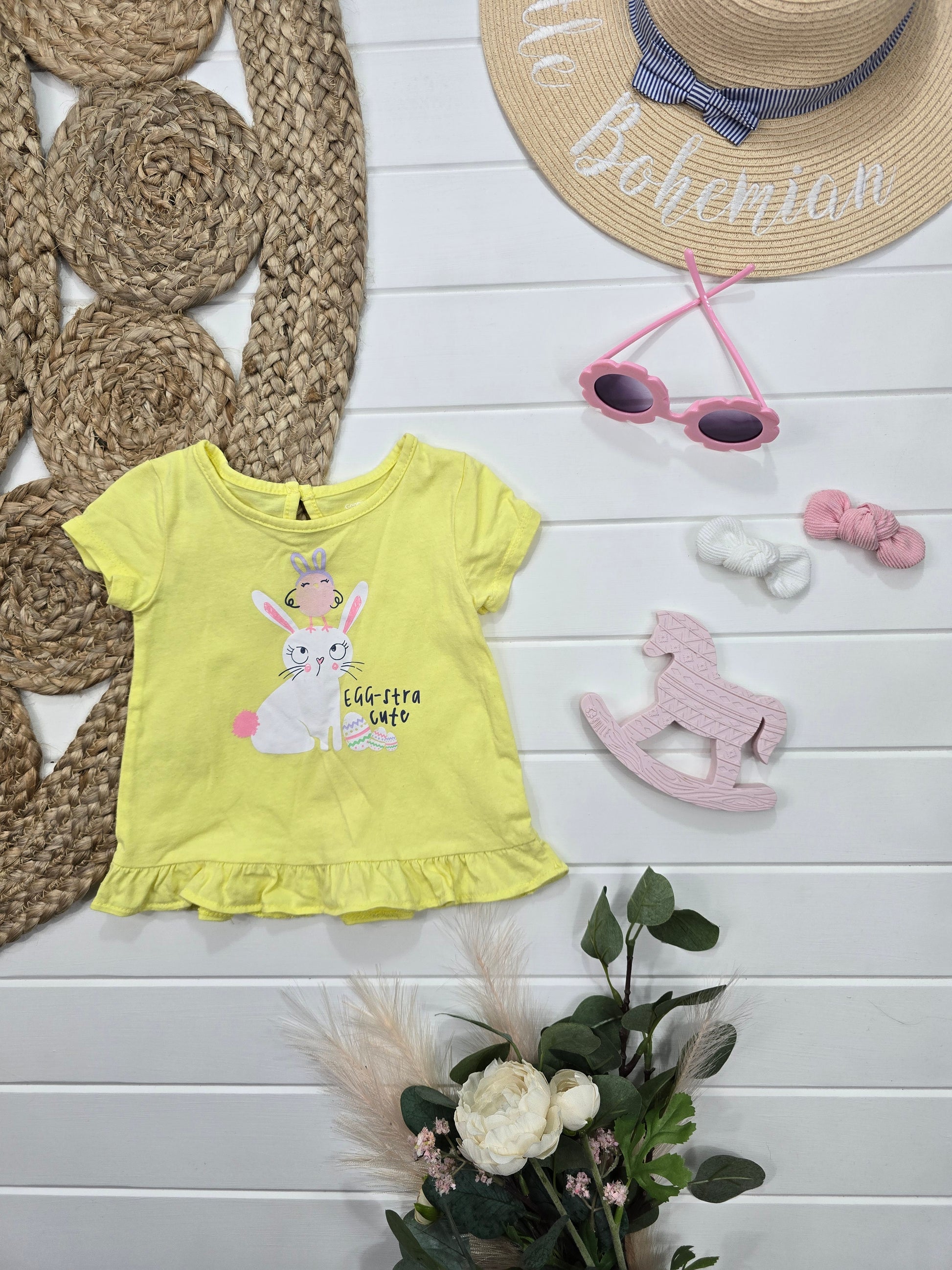 Ce T-shirt jaune George, taille 6-12 mois, est parfait pour votre bébé! Avec son adorable motif de lapin qui dit "Egg-stra cute", votre petit rayon de soleil fera fondre les coeurs. Fabriqué avec des matériaux doux et confortables, ce T-shirt est non seulement mignon, mais aussi pratique pour votre bébé en pleine croissance.